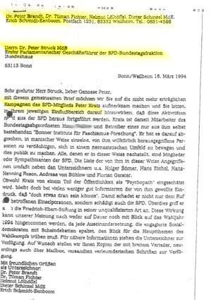 Rechts and Crime Ein Quintett hat sich gefunden, um gemeinsam Politik zu betreiben: Dieter Schinzel, Tilman Fichter, Peter Brandt, Erich Schmidt- Eenboom, Helmut Lölhöffel. Die Kontakte der fünf zum Neofaschismus haben wir vielfach öffentlich gemacht. Nun schrieben sie gemeinsam einen Brief an den "Ersten Parlamentarischen Geschäftsführer" der SPD-Bundestagsfraktion, Peter Struck, den wir auf der Rückseite dokumentieren: Ein Anschlag auf das Grundgesetz, auf die freie Entscheidung der Abgeordneten. Weniger die kaum verhohlene Forderung an Struck als vielmehr ihre positive Resonanz in der Spitze der SPD-Fraktion ist ein Novum in der Geschichte des demokratischen deutschen Parlaments. Die Resonanz findet allenfalls noch in den Verbotsgründen des Bundesverfassungsgerichtes gegen die KPD eine Parallele. Das Quintett spricht diejenigen in der SPD an, die seit Jahren für den Niedergang der Sozialdemokratie Verantwortung tragen und erhofft sich wohl - nicht zu Unrecht - eine Politik der verbrannten Erde gegenüber den Sozialisten in der Partei. Berufsverbote sind wieder angesagt, denn freie Bahn muß her für eine Politik des Sozialabbaus und der weltweiten Bundeswehr-Kriegseinsätze. Unfaßbar ist es, wenn hierbei sogar - wie selbstverständlich - ein Milieu ins Spiel kommt, das vielfach zum Kriminellen hin ausfranst. "Wann wir schreiten Seit' an Seit'" Das gemeinsame Auftreten dieses Quintetts beweist, was wir seit Jahren in Einzelfällen immer wieder nachgewiesen haben: Es existiert in der SPD eine einflußreiche nationalrevolutionäre Hintergrund-Szene. Die "Konservative Revolution" hat in der SPD einen Brückenkopf, von dem aus Partei- und Fraktionsspitze erreichbar sind.Ein