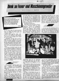 erstmalig im Januar 1983 in der Bonner Stattzeitung "De Schnüss".) Jetzt sei ruhig und halt den Kopf ganz still Heut ist die Nacht, wo ich es wissen will Denk an Torpedos und an U-Boot-Krieg und daran, daß auf dir eine Leiche liegt Denk an Feuer und Maschinengewehr Und an den Sieg vom deutschen Heer (Text der Band "Abwärts" als Prolog) Vor 50 Jahren zogen die Nazi-Provokateure durch die Straßen und prügelten Juden und Linke tot. Wenigstens die Linke wehrte sich und prügelte zurück. Heute ziehen Jungnazis, Rocker, Skinheads durch die Straßen und prügeln Ausländer und Linke. Zumindest einige irgendwie Linke wehren sich und prügeln zurück. Rechte auf Linke auf Rechte. Jugendgewalt, das geht mich an, weil ich sowas nicht will. Ich frage mich, ob sie Ausdruck faschistischer Tendenzen in der Jugend(kultur) ist, bei den Individuen. Wir haben lange Jahre gegen Berufsverbote, Isolationshaft, Polizeiwillkür gekämpft. Faschistische Tendenzen gingen vom Staat aus und trafen das Volk - oder vielmehr uns. Nun kommen sie aus dem Volk. Rufe ich jetzt die Polizei, damit sie mich schützt? Mit schwirrt der Kopf: Krawall, ein Toter bei der Bundesliga. Schlägereien zwischen Skinheads und Panx in Wuppertal, im Kölner Stollwerk. Rockerangriff auf Punks im NamNam. Krawall nach dem "Abwärts"-Konzert in den Rheinterrassen durch Punks. Der Veranstalter des "Dead Kennedys"-Konzerts in Bad Honnef engagiert Rocker, die den Kursaal sichern sollen. Mit Schlagstöcken und Pistolen bewaffnet tasten sie jeden ab und nehmen den Panx Gürtel und Ketten ab. Draußen marschiert Polizei auf, in den Gängen des Kurhauses ist sie versteckt postiert, mindestens 50 Mann. Es wird ein friedliches Konzert mit viel Spaß für Publikum und Bands. Das verschreckte Bürgertum besinnt sich seiner Soziologen: "die Gewaltbereitschaft steigt", "Lebensangst und die Vorstellung einer verschlossenen Zukunft bedrucken die Jugendlichen". Alles geht den Bach runter. "Vielleicht sind wir ja gerade deshalb so gut drauf, weil wir frustriert sind von allem um uns herum", sagt ein arbeitsloser Skinhead der Kölner STADTREVUE. "Skins sind aus der Arbeiterjugend entstanden." - "Also dauernd werden vom Dritten Reich nur die schlechten Sachen erzählt. Adolf hat genau das gemacht, was die Leute brauchten, er hat ihnen Arbeit gegeben und wieder eine Zukunftsperspektive." - "Daß Deutsche Arbeit haben, sollte im Vordergrund stehen. Ich sehe nicht ein, daß es einem Ausländer besser geht als mir." - "Deutschland hat sich zum Abfalleimer Europas entwickelt." In dem Skinheads Interview der STADTREVUE tritt ein geschlossenes nationalsozialistisches Weltbild zu Tage, dessen Handlungskompetenz Gewalt ist: "Das ist der einzige Weg. Quatschen bringt sowieso nichts ein." Das macht das Urteil einfach. Aber Gewalt muß ja nicht gleich körperlich sein. Der intellektuelle Mensch hat andere Möglichkeiten, Hochmut und Überlegenheit darzustellen, wenn er den ökonomischen Zwängen des Systems als Opfer unterliegt. Neon, Strenge, Geometrie - der kalte Glanz des New Wave. Kuzer Haarschnitt, auf kantig geschminktes Gesicht, schwarzes Leder bis zum Militärstiefel. Brutalität wird stilisiert, dadurch mittelbar. Unsere Sensibilität für Faschistoides reicht bei der körperlichen Gewalt, nicht mehr beim "Kult der Kälte". In mancher Scene-Kneipe fühle ich mich in einer Gesellschaft von Flagellanten und Sadisten. Das gefühllose Raster der Betonwohnsilos findet sich im Layout der linken Zeitungen wieder. Musik und Texte der deutschen Kult-Bands sind deprimiert, perspektivlos, brutal. Die Jugendkultur ist teilweise vom Protest gegen das Packeis zur Identifikation mit ihm übergegangen. Eine Möglichkeit, darin zu überleben? Daraus eine wärmere Gesellschaft zu machen?Ich sehe in den Spiegel. Nach dem Fehlfarben-Konzert in Bonn war ich zweifach unsicher. Die Gruppe gefiel mir und mein Urteil, sie sei faschistoid wurde von meinen Freunden nicht akzeptiert. Nach dem "Abwärts"-Konzert ging es mir noch schlechter, weil ich die Musik noch besser finde und noch brutaler, die Texte ausweglos, Endzeitmusik. Das schwarze Leder gefällt mir auch, kontrastierend mit dem weißen Glitzerluch. Auch die schweren Hals- und Armbänder der Punks. Hätte mir die schwarze SS-Uniform mit dem weißen Revers auch gefallen? Ich bin es (neben Bello), der immer die geometrischen Raster auf die SCHNUSS-Seiten klebt, kalte Schönheit. Meine nur reflexartige Widerspiegelung der Gefühliosigkeit einer leeren Welt? Ich kann sehr wohl intellektuell den Unterschied analysieren zwischen bewußten, linken Panx (die bei Demos meist als erste von der Polizei ergriffen werden) und Neofaschisten. Zwischen der Stilisierung der Kälte im New Wave und der Natürlichkeit des Verhaltens der Punks untereinander, die wild und aggressiv ist. Zwischen emanzipatorischer und repressiver Gewalt. Ich weiß sehr wohl, daß die Anti-Akw-Bewegung und die Hausbesetzer-Bewegung gewaltlos keinerlei gesellschaftliche Resonanz erhalten hätten. Mein Problem bleibt. Ich frage mich, ob wir mit der Übernahme von Formen nicht auch Inhalte in unser Bewußtsein übernehmen, ohne es zu merken. Nach dem TUWAT-Fackelzug durchs Berliner Prominentenviertel im letzten Jahr gab es eine Diskussion in der taz, ob die Springer-Presse nicht recht habe mit ihrem Urteil, es sei gewesen wie 1933. Viele Skins wären vorher Panx. Zufall? Der Habitus von Lederjacken und Ketten schüchtert andere ein (am wenigsten die Herrschenden), macht den Trägern Mut. Es ist nicht im Sinne wie immer auch Linker, andere Gruppen des beherrschten Volkes einzuschüchtern. Nach dem Dead-Kennedys-Konzert konnte ich mit der Gruppe darüber reden. Die Aufmachung der Panx sei keine Identifikation mit Brutalität, meint ihr Sänger Jello Biafra. Sie sei sowohl Protest gegen eine kleinbürgerliche Ideologie als auch gegen die Hippies der 60er Jahre. Daß er selbst Stiefel trage, heiße nicht, daß er damit jemanden trete. Wie kann ich so noch gegen die Rockerk