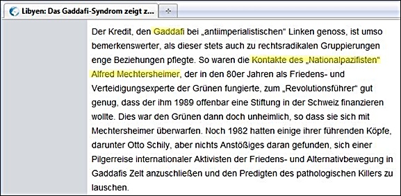 nach der wiener tageszeitung "Der Standard" klaut nun auch springers "Die Welt" aus unserer "Gaddafi-Mechtersheimer"- broschüre von 1990: "Die Welt"-artikel (online) vom 10. märz 2011: ![]() allerdings versäumte es "Die Welt" im gegensatz zum "Standard", auf