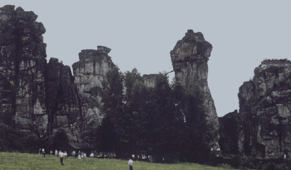 Die Felsformation der Externsteine im Teutoburger Wald zur Sommersonnenwende. "Fels II" (zweiter von rechts) mit der obskuren Zelle der Begierde.Die Legende kam auf, hier habe sich ein Naturheiligtum aus der heidnischen Vorgeschichte der alten Germanen befunden. Wie praktisch, denn Natur und Naturspiritualität kennen die Forderung der bürgerlichen Revolutionen nach der Emanzipation des Menschen nicht. In der Natur herrschen nicht die Werte der Französischen Revolution, sondern Gebundenheit an die vorgefundenen Verhältnisse, Ungleichheit der Individuen und das Recht des Stärkeren im Kampf ums Dasein. Eine nationale Gedenkstätte konnte man brauchen in der Zeit der Besetzung Deutschlands durch die Truppen Napoleons, die für die Revolution standen, erst recht eine vermeintlich naturreligiöse, geheiligte und die Gegnerschaft zur Revolution heiligende Stätte. Da paßten barocke Orgien nicht ins Bild, denn die Teilnahme an solcher Lebensqualität forderten die unterdrückten Menschen in den bürgerlichen Revolutionen und Revolten ja gerade ein. Also weg mit dem alten Gemäuer. Das heutige Aussehen der Externsteine ist ein Werk der Romantik, die Wiese davor ein Werk der Nazis, der Großparkplatz für die sommerlichen Touristenmassen eine Errungenschaft des Fünfziger-Jahre-Wirtschaftswunders - hier hinterläßt wohl jede Epoche deutschen Stolzes Spuren.