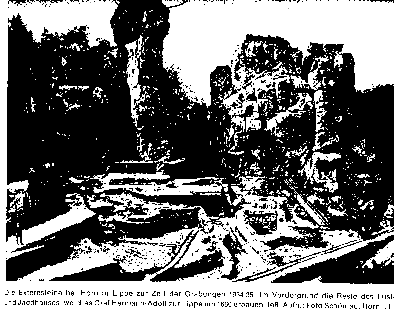 Das Bild zeigt die Nazi-Grabungen. Bildmitte: "Fels II" mit der Kammer, noch von Bäumen zugewachsen, rechts "Fels I" mit dem Relief und der "Irminsul".