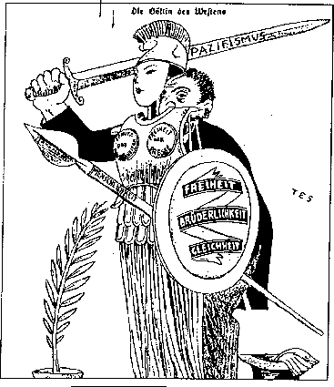 Judentum, Christentum, Liberalismus und Sozialismus, das waren und sind die Haßbilder für völkisch-neuheidnische (Neo-) Faschisten, denn diese Weltanschauungen vereint die Ansicht von der Gleichheit der Menschen, mal vor Gott, mal vor dem Gesetz, mal in sozialer Hinsicht. In dem Nazi-Witzblatt "Die Brennessel" erschien 1938 eine Hetzkarikatur der "Göttin des Westens", wie die Überschrift hieß. "Sancta Democratia" ist hier als antike Kriegsgöttin dargestellt, die Aufschrift auf ihrem Schild lautet "Freiheit, Brüderlichkeit, Gleichheit" und auf dem Schwert "Pazifismus". Doch diese Göttin ist nur Maskerade von Helm, Brustpanzer und Tunika, die an einem Kreuz zu einer Art "potemkinschen" Puppe aufgehängt sind. Dahinter steht der typische Jude der Nazi-Hetze und leiht der Göttin seine Arme, zum Schwert auch noch den Speer "Menschlichkeit" schwingend. Dagegen steht "Natürlichkeit", die Göttlichkeit des Kosmos, die weder menschliche Freiheit noch Gleichheit kennt, weil es diese in der Natur und ihren Gesetzen nicht gibt. Ein vermeintliches Naturheiligtum nordischer Germanen wie die Externsteine verschafft der "eigenen" Religion der Ungleichheit - die deshalb nur mystisch erfahrbar ist, weil die Gleichheit der Menschen in Wahrheit das Natürlichste auf der Welt ist - eine auch sinnlich unbezweifelbare Basis.