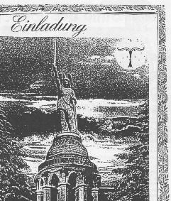 Der "Bund der Goden" rief zum "Hermannstag 1995" ans Denkmal, wo sich bis heute ebenfalls immer wieder rechtsextreme Gruppen versammeln. Oben rechts im weißen Kreis das stilisierte Irminsul-Zeichen vom (christlichen) Felsrelief der Externsteine, wieder aufgerichtet, hier mit dem Nordstern ober drüber und dem Sternbild des Großen Bären. In dieser Form, um die Sterne ergänzt, verwendet auch Jürgen Riegers "Artgemeinschaft" das Irminsul-Zeichen.Das drohend gegen Westen, gegen den "Erbfeind" Frankreich erhobene Schwert des Hermann auf dem Denkmal ist weithin übers Land sichtbar. Es symbolisiert eine Geisteshaltung von deutscher Romantik, völkischer Bewegung und NS-Ideologie, die sich auch bei heutigen Anhängern der Naturreligion wiederfindet: Germanische Naturmystik siegt über westliche Aufgeklärtheit, germanische Kraft und Gesundheit über westliche Zivilisationskrisen. Das Zurück zur Natur ist hier als ein Zurück zu deutscher Weltherrschaft in Kupfer geschmiedet. Auf dem Schwert steht, nach der Restaurierung jetzt wieder in goldenen Buchstaben: "Deutschlands Einigkeit meine Stärke, meine Stärke Deutschlands Macht". Das monumentale Denkmal wurde vom Kaiser damals persönlich eingeweiht. Es symbolisiert den Sieg des "Nordischen" über das "Welsche", die Wiedergeburt des vermeintlich Eigenen aus der eingebildeten Überfremdung und die Wiedergeburt des "Reiches". Die Bronzereliefs am Sockel, die aus dem Metall erbeuteter französischer Kanonen aus dem Krieg 1870/71 gegossen wurden, erzählen dies.