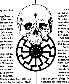Das Sonnenrad des SS-Kultraums der Wewelsburg (hier zusätzlich mit Totenkopf) aus einer Werbeanzeige des rechtsextremistischen "Nation-Europa-Buchdienst" für seinen "Bestseller": das Buch "Die Schwarze Sonne von Tashi Lhunpo" des SS-Mannes Karl Steiner, der "im tibetischen Kloster Tashi Lhunpo" nach der buddhistisch-nazistischen Einheit suchte, wie der Buchdienst hierzu schreibt.Nicht nur "Huginn und Muninn", sondern auch die weit verbreitete New Age-Zeitschrift "esotera" zeigt den Zusammenhang von New Age und Faschismus. Der New Ager Roman Schweidlenka versuchte hier im Dezember 1991, unter einem Bild der Externsteine, das naturreligiöse Neuheidentum vom Faschismusvorwurf reinzuwaschen und den Nazis "Mißbrauch" vorzuwerfen. Offenbar war ihm der Inhalt des Armanen-Blattes "Irminsul" entgangen, dessen Titel er im Faksimile zur Illustration abdruckte. Der Chef der rassistischen Berliner "Heidnischen Gemeinschaft e. V.", Géza von Neményi kommt recht gut als Freund der Germanen und Indianer weg. Der 1958 geborene "Gode" Neményi wurde Mitte der achtziger Jahre im Zusammenhang mit der Zwangsauflösung des angebräunten Berliner Landesverbandes der Partei Die Grünen bekannt; er war als dessen Mitglied ein Auslöser der Streitigkeiten. Schweidlenka erwähnt in "esotera" zwar das Sonderheft des "Materialdienstes der Evangelischen Zentralstelle für Weltanschauungsfragen" zum Neuheidentum, das ein paar Monate vorher - sogar mit einem Beitrag Schweidlenkas - erschienen war, verschweigt jedoch die dort aufgeführte Mitgliedschaft Neményis im faschistischen Armanen-Orden und den ebenfalls dort genannten Bezug von Neményis "Heidnischer Gemeinschaft" auf Mathilde Ludendorff, Gründerin des rassistischen "Bund für Gotterkenntnis - Ludendorffer".