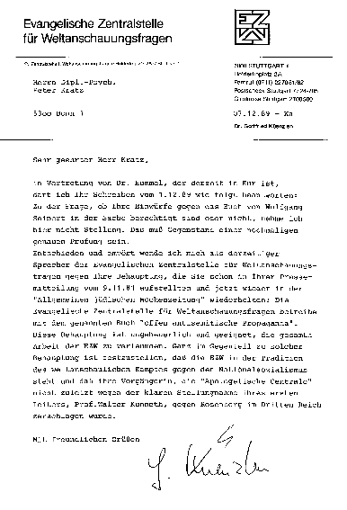 (100) Hummel in einem Brief an Verf. vom 13. 7. 1990: "Gegenwärtig sehe ich nicht, daß Seiberts Buch als Rechtfertigung einer völkisch-rassistischen Haltung benutzt wird. Ich vermag auch nicht zu erkennen, daß es sich dafür eignet. Darum besteht für mich zur Zeit kein Anlaß in dieser Sache Schritte zu unternehmen."