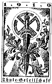 Das Zeichen der "Thule-Gesellschaft" von 1919, der unmittelbaren Vorläuferin der NSDAP, mit dem "Sonnenrad", dem abgerundeten Hakenkreuz, das nach 1933 von der "Deutschen Glaubensbewegung" als ihr Zeichen übernommen wurde. Den Dolch übernahm die SS in die Wirklichkeit als "Ehrendolch" mit SS-Rune, der als eine Art Orden verliehen wurde.