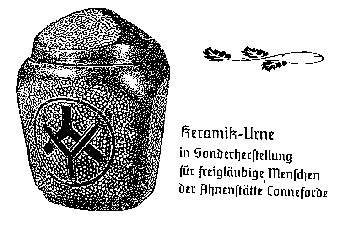(Aus der Jubiläumsbroschüre des "Ahnenstättenvereins Conneforde" 1998).Im freireligiös-pantheistischen Bereich gehörte die Bereitschaft zum Freitod immer schon zur weltanschaulichen Grundausstattung, ebenso in der Konservativen Revolution und ihren Nachfolgern, wo Arthur Moeller van den Bruck ein historisches und Bernard Willms ein aktuelles Beispiel sind. Bei einem Josef Goebbels erstaunt auch die selbstgöttliche Tat des Mordes an seinen Kindern in den letzten Tagen des "Dritten Reiches" nicht, Faschisten sehen hierin sogar die väterliche Fürsorge wirken. Trifft dies in der Regel nur diejenigen, die "Hand an sich legen" (Jean Améry), so geht die Todes-Diskussion, die in den achtziger Jahren um den Peter Singer und seine "Praktische Ethik" aufkam, alle an: In den Zeiten drastischen Sozialabbaus kommen alle als potentielle Opfer dieser neuerlichen "Ethik" des Todes in Frage.