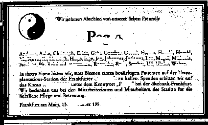 Der Pflegenotstand in den Krankenhäusern und Altenheimen dient der DGHS auf Werbeveranstaltungen als Argument, sich den Zugriff auf Zyankali-Kapseln durch einen Beitritt in die Organisation zu sichern. "Ist es nicht verständlich, daß mancher alte und kranke Mensch lieber tot sein will, als seine eigenen Kinder zum Sozialhilfeempfänger zu machen", schrieb Atrott in einem DGHS-Blatt. Auch nach Atrotts Ausscheiden paßt in der DGHS-Zeitschrift "Humanes Leben - Humanes Sterben" noch alles zusammen: "Euthanasie: Wahrheit und Mythos" und "Ärztliche Ethik für Euthanasie" heißen im Dezember 1993 hier Artikelüberschriften, eine Veranstaltungsreihe der DGHS mit "Lesungen aus der Lyrik von Rainer Maria Rilke" wird angekündigt. Unter dem Foto aus einem überfüllten Krankenhaus - Bildunterschrift: "Kein Platz für Kranke" - steht die Liste der DGHS-Adressen. So findet die Ideologie des Zusammenfalls von Leben und Tod, von Leid und Glück, ihre praktische Aufgabe in Zeiten der "Deregulierung". Im "sanften" Gewand des New Age kehrt eine Sozial- und Wirtschaftspolitik des Todes zurück, die im Faschismus zu den selbstverständlichen Grundlagen gesellschaftlicher Planungen zählte. (392)