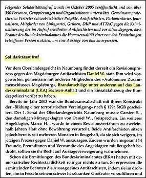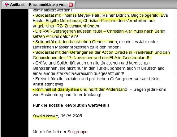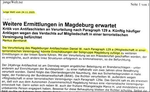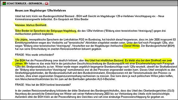 Wie auch schon bei der Terrorismus-Unterstützung im Irak, nutzte Bernhardt seine Stellung in der "jungen Welt" auch zur Unterstützung der Magdeburger Terroristen und brachte einen Artikel über den Fall dort unter. Der hetzerische Bericht agitiert gegen die staatlichen Strafverfolgungsbehörden, doch selbst das ist für Wowereit kein Grund, sich von Bernhardt fernzuhalten: Nachdem der Bundesgerichtshof im Jahr 2007 das Strafmaß gegen Daniel Winter, zwei Jahre Haft ohne Bewährung, bestätigt hatte, machte Bernhardt ein Interview mit der Sprecherin der Magdeburger Soligruppe, das auf der pro-terroristischen Internet-Seite "Schattenblick" veröffentlicht wurde, die die "Freiheit" für alle möglichen Terroristen fordert, selbstverständlich auch für alle RAF-Mörder: ![]() Offensichtlich ist also der