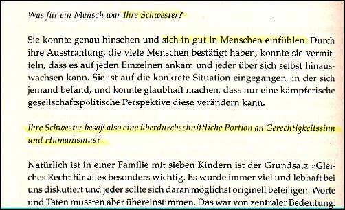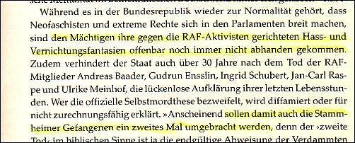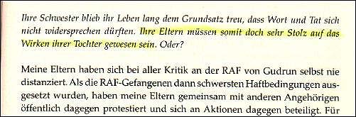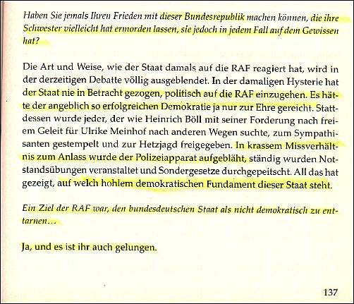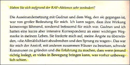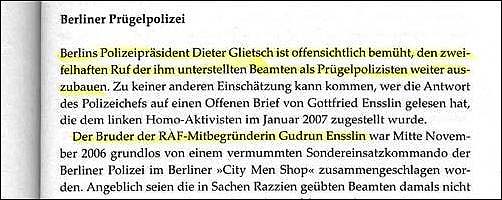 Das also gehört auch zu Wowis Welt -- alltägliche Gewalt, wo man hinschaut, und gleichzeitig Verleumdung der "Berliner Prügelpolizei". In seinem Buch "Schwule Nazis" bringt Bernhardt durch seine unverhohlene Solidarität mit den RAF-Mördern der 70er Jahre dann noch eine Breitseite gegen den bundesdeutschen Verfassungsstaat und seine Sicherheitsorgane. Der spätere Wowereit-Interviewer tarnt es im Jahr 2007 in ein Interview mit dem schwulen Bruder der Mörderin Gudrun Ensslin, die sich bei Palästinensern im Nahen Osten für das Mordhandwerk hatte ausbilden lassen, bevor sie unschuldige Menschenleben auf ihr Gewissen nahm, aber in Bernhardts Buch dennoch und völlig kritiklos als gültiges Vorbild für Bernhardts Politik (-empfehlungen) hingestellt wird: Mit der RAF als politischem Ideal im