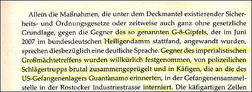 Auszüge aus Bernhardts Buch "Schwule Nazis" aus dem Jahr 2007: ![]() ![]() ![]() ![]() Die Bundesrepublik Deutschland als Terrorland, die Parteien des Bundestages genau so wie die Neonazi-Parteien. Da mag Wowereit sich gefragt haben: Warum nicht mal auch so jemanden hätscheln, der mit Verfassung und Rechtsstaat auf Kriegsfuß steht, solange er nur schwul genug ist? Gefragt, getan -- wenn man, wie Wowereit, jede Stimme braucht! Das Buch Bernhardts, aus dem diese Scans (und die anderen weiter unten) stammen und das im wesentlichen Propaganda für die antisemitische RAF und den Versuch, die Ideen Ernst Röhms und Michael Kühnens zu popularisieren, enthält, wurde besonders vom Berliner schwulen Buchladen "eisenherz" beworben, der das Buch lange im Schaufenster ausstellte. (Gelbe Text-Markierungen durch BIFFF...) Weiter BIFFF...-Leiter Peter Kratz über Wowereits Ignoranz: "Wir haben auch schon 2005 und 2006 die Querverbindungen zwischen 'Box', Bernhardt und anderen und der von Wowereit geförderten Berliner Gewaltsex-Szene veröffentlicht und auch Wowereits Abgeordnetenbüro immer wieder darüber informiert, wie auch zahlreiche andere Mitglieder des Berliner Abgeordnetenhauses und die Medien unsere Informationen erhielten. Also muss Wowereit wissen, mit wem er es zu tun hat, wenn er sich auf Bernhardt einlässt. Es wäre kaum glaubhaft, wenn Wowereit sich jetzt zu verteidigen versuchte, er habe von allem nichts gewusst. Dann muss er seine Abgeordnetenpost nicht gelesen haben. Außerdem ist das Material, auf das wir uns stützen, auch im April 2009 weiterhin im Internet öffentlich zugänglich. Das gilt auch für Bernhardts zahlreiche "Box"-Artikel. Wenn wir es konnten, so kann sich jede und jeder, sogar Wowereit, der über einen riesigen staatlich finanzierten Apparat verfügt, darüber informieren. Im Internet wird auch im April 2009 noch weiter, unter anderen mit Bernhardts und Raussendorffs Namen, für die '10 Euro'-Kampagne gesammelt und sogar eine Kontoverbindung angegeben. Auch Bernhardts Aufrufe für anti-israelische Demonstrationen, die schon vor Jahren stattfanden, sind Anfang April 2009 immer noch online, das haben wir geprüft und gespeichert, ebenso Bernhardts Befürwortung von Gewaltaktionen. Mitte April dagegen sind einige plötzlich offline. Ob Wowi schon was gemerkt hat, nachdem in der Schwulenszene sein Bernhardt-Interview verteilt wird? Pech gehabt, denn diese pro-terroristischen Texte mit Bernhardts Namen, die wir hier als Screenshots abbilden, sind auch weiterhin im Internet-Archiv 'Wayback Machine' anzusehen!" Gerichtlich festgestellter Terrorismus-Sympathisant im Internet breit bekannt Bernhardt taucht im Internet, wie unsere Google-Recherche ergab, mit verschiedenen Bezeichnungen auf, mal mit dem Namenszusatz "DKP Dortmund", wo er wohl politisch in der DKP-Jugendorganisation SDAJ erstsozialisiert wurde, dann als "Student, Dresden", wo er wohl eine Zeit lang studierte, auch als "Student, Berlin", dann wieder als "Journalist" oder "freier Mitarbeiter der Tageszeitung Junge Welt" usw. Es ist immer dieselbe Person, und eine journalistische Ausbildung hatte er jedenfalls bis vor kurzem keineswegs; ob er inzwischen, wo er immer öfter in Berlin auftaucht, tatsächlich irgendein Examen geschafft hat, wissen wir nicht. Er erscheint vielmehr als ein Abgesandter der DKP, der neben der "jungen Welt" auch für die DKP-Parteizeitung "unsere zeit" und für die PDS/"Linke"-Parteizeitung "Neues Deutschland" schrieb. In der "Irak-Solidarität" hat sich Bernhardt offen für terroristische Gewaltaktionen ausgesprochen: "den bewaffneten Kampf". Auszug aus einem Bernhardt-Rupp-Aufruf