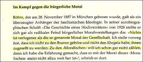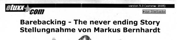 ![]() Bernhardt wollte in der "Gigi"-Gedenknummer für Ernst Röhm vom Juli 2004 über die Armee der altgriechischen Stadt Sparta schreiben, um Kühnens Ideen von soldatischem schwulem Heldentum zu popularisieren, doch er kam beim Führer des Jahrhunderte jüngeren römischen Sklavenaufstands, Spartakus, aus, und ein paar Zeilen weiter dann noch beim Spartakistenaufstand von Rosa Luxemburg und Karl Liebknecht 1919 (oben ein Ausschnitt aus Seite 9 von "Gigi" Nr. 32). ... und "Box"-Autor Markus Bernhardt im August 2004: ![]() ![]() In dem inzwischen nicht mehr existierenden Berliner Internet-Chatroom "etuxx", der "sexualpolitisch" auch mit der pro-Pädophilie-Gruppe "whk" verbunden war und auch den Soli-Aufruf für die Magdeburger Terroristen unterzeichnete, hat Bernhardt selbst in eindeutiger Weise zum "Barebacking" Stellung genommen: ![]() ![]() In Bernhardts Buch "Schwule Nazis" wird deutlich, wie geschickt er die "Barebacking"-Propaganda, die für ihn wohl Teil des "antiimperialistischen Kampfes" ist (je mehr Infizierte im verhassten "Westen", desto schneller käme dann wohl der Untergang des Abendlandes und der erhoffte Aufstieg der bizarren Nationalsozialismus-Stalinismus- Islamismus-Mischung), mit den Ideen der SA-Nazis verbindet. War schon Kühnen nur ein irrer ein SA-Apologet, der mit einer schwulen Soldateska für Saddam Hussein gegen die UN und die USA in den ersten Irak-Krieg ziehen wollte, so zitiert Bernhardt in seinem Buch, in dem erneut Kühnen breit zu Wort kommt, auch den SA-Führer Ernst Röhm gegen die "Moralapostel", gegen die er schon in seinem "etuxx"-Beitrag "spartakistisch" zu Felde zog: Mit dem SA-Terroristen Ernst Röhm