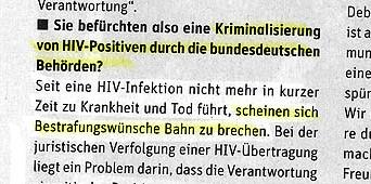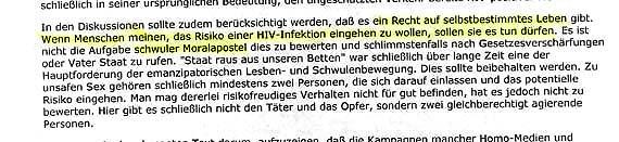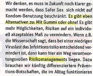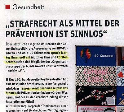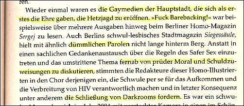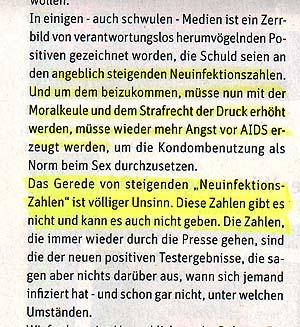 aus der Schwulenszene: ![]() ![]() ![]() Die von Bernhardt genannten "Gaymedien der Hauptstadt" hatten allerdings bisher in Wort und Bild Klaus Wowereit propagiert, besonders vor Wahlen. Fragt man sich, warum sich Wowereit dennoch auf Bernhardt einließ, kann man auf Wowereits politische Abhängigkeit von den alten DDR-Strukturen verweisen. Dort trifft man auf so manche Merkwürdigkeit, wie zum Beispiel den Landesgeschäftsführer der Berliner PDS/"Links"-Partei Carsten Schatz, der gemeinsam mit Bernhardt in einem "Box"-Interview im Oktober 2007 gegen staatliche AIDS-Aufklärungsprogramme hetzte. Muss Wowereit mit Bernhardt sprechen, weil alte DDR-Strukturen es ihm abverlangen, weil er sonst seine Mehrheit verliert? Weil er diese Strukturen braucht wie die Hängematte die Bäume? In dem Interview behauptet Schatz, die jährlich veröffentlichten HIV-Infektionszahlen seien falsch und würden aus politisch-propagandistischen Gründen veröffentlicht. In grob unverantwortlicher Weise redet der Berliner "Linke"-Landesgeschäftsführer die tatsächlichen Zahlen klein, obwohl allein nur in Berlin immer noch wöchentlich zwei Menschen an AIDS sterben: "Das Gerede von steigenden 'Neuinfektionen' ist völliger Unsinn. Diese Zahlen gibt es nicht und kann es auch nicht geben", so Schatz. Und weiter gegen die aktuelle Diskussion gerichtet , die auch die 650 jährlichen (!) AIDS-Toten in Deutschland berücksichtigt, sagt Schatz in einer schon psychopathisch zu nennenden Logik: "Seit eine HIV-Infektion nicht mehr in kurzer Zeit zu Krankheit und Tod führt, scheinen sich Bestrafungswünsche Bahn zu brechen." Am Ende spricht er sich, ähnlich wie Bernhardt, für ein "individuell akzeptables Maß" des Risikos der Infektionsübertragung aus und plädiert verklausuliert ebenfalls für Toleranz gegenüber "Barebackern": ![]() Unverantwortlich versucht Schatz, die steigenden Infektionszahlen klein zu reden: ![]() Auf die paranoide und infame Suggestivfrage von Bernhardt gibt "Links"-Partei-Landesgeschäftsführer Schatz die gewünschte Antwort ... ![]() ... und kommt zur Propagierung des "Risikomanagements" auch ohne Kondom: ![]() Das also gehört auch zu Wowis Welt. Berlins Konservative haben sich seinerzeit diesen politischen Skandal um Schatz entgehen lassen: dass der Landesgeschäftsführer einer im Senat mitregierenden Partei die HIV-Infektionsgefahr klein redet und "Barebacking" toleriert sehen will. Sein "Risikomanagement" auf Kosten der Sozialversicherten würde der "Links"-Partei wohl die gewerkschaftlichen Stimmen kosten, wäre das Bernhardt-Schatz- Interview breiter bekannt. Denn die Kosten für die HIV-Politik dieses eigenartigen Berliner "Linke"-Funktionärs trägt die Solidargemeinschaft der Versicherten -- für diese Szene ein Fremdwort, hier geht es wohl nur noch darum, möglichst viel aus öffentlichen Kassen abzocken zu können, wie Bernhardt damals bei der Sozialhilfe (siehe oben). Derartig abwegige "Politik" steht breitgetreten auch in Bernhardts 2007 erschienenem Buch "Schwule Nazis" aus dem Bonner Verlag "Pahl-Rugenstein Nachf." des DKP-Mitglieds Arnold Bruns, mit dem Bernhardt auch beim pro-terroristischen, anti-israelischen "Deuschen Solidaritätskomitee Freier Irak" zusammenarbeitet (siehe oben). Bruns führte zu den Zeiten des "real exist. Soz." die Bonner "Progress-Buchhandlung", die sich auch aus den Buchkäufen der Bonner Botschaften der Ostblock-Staaten für deren Bibliotheken finanzierte. Allerdings ging kaum jemand in diese Bibliotheken, die Buchkäufe dienten faktisch der Finanzierung der "Progress"-Landenkette, wenn die Kunden mit DKP-Parteibuch dafür nicht mehr ausreichten. Mit dem Ende dieser Staaten war auch die "Progress"-Buchkette am Ende, und Bruns mußte sich wegen schwerer Vorwürfe zu seiner DDR-Zusammenarbeit verantworten. Dass es sich bei seinem heutigen Verlag um einen MfS-Reste-Verlag handelt, hält wohl nicht einmal er selbst für eine bösartige Unterstellung; schon der Vorgängerverlag des "Nachfolgers" lebte zu einem großen Teil von Linzenzausgaben der DDR, die nicht einmal neu gesetzt, sondern faksimiliert nachgedruckt wurden (wobei hier in den 70er und 80er Jahren auch einige wichtige Bücher der westdeutschen Linken erschienen waren, die dann aber zum Teil nicht auch in der DDR erscheinen durften). Im wesentlichen enthält Bernhardts Buch RAF- und "Initiativ e.V."-Propaganda (was wohl die Solidarität mit irakischen Terroristen mit Schwulenpolitik zu tun hat?). Auch hier kommt breit Kühnens Schrift "Homosexualität und Nationalsozialismus" zu Wort, allerdings hat Bernhardt nun die "spartakistische Armee" zur "Armee von Sparta" verändert, nachdem wir uns schon im Jahr 2005 über seine Dummheit öffentlich lustig gemacht hatten. Groteske Angriffe aus der RAF-Welt auf den LSVD und das Anti-Gewalt-Projekt "Maneo" fehlen ebensowenig wie auf die Berliner Polizei. Am Ende des Buches teilt Bernhardt dem schwulen Publikum die Kontaktadressen pro-terroristischer Gruppen wie dem "Gegeninformationsbüro", der "Roten Hilfe" und dem "Initiativ e.V.", dem er so viel Lebenszeit geopfert hat, mit und will auch Kontakt zum Kindersex-Magazin "Gigi" vermitteln. Soldarität mit