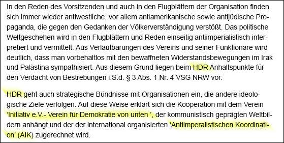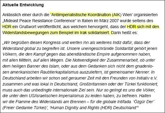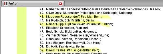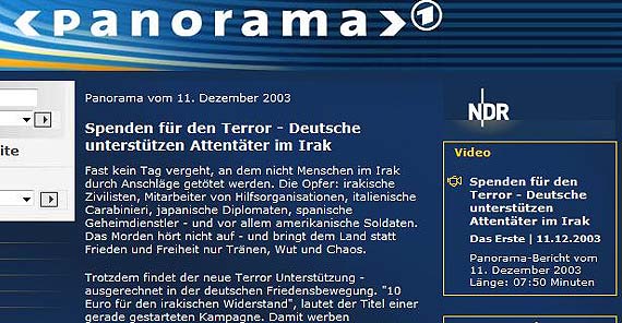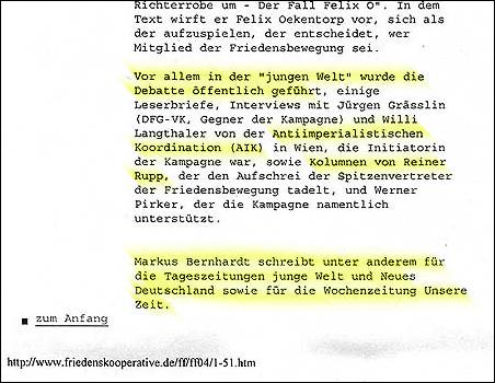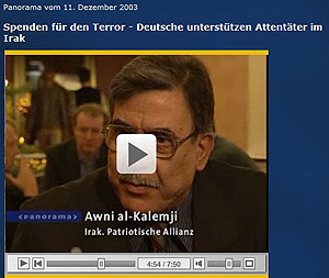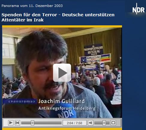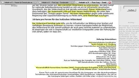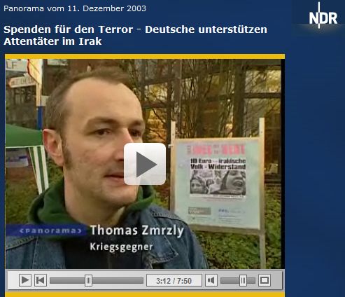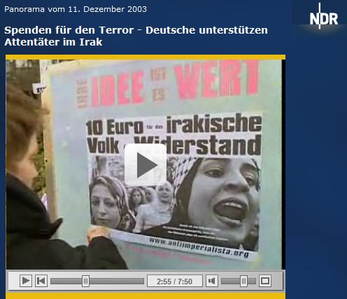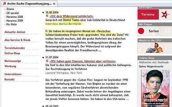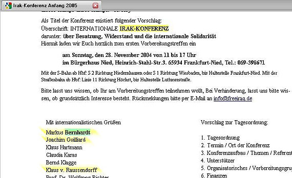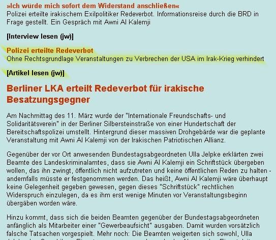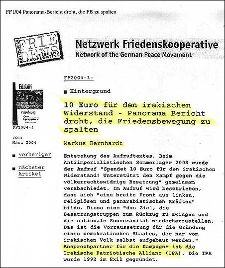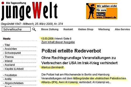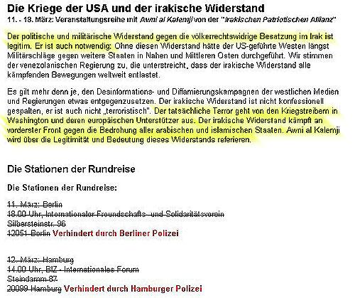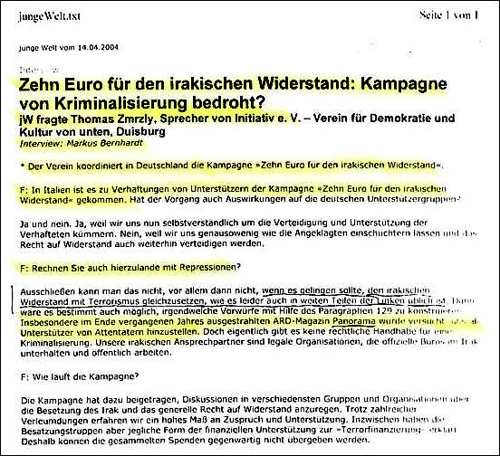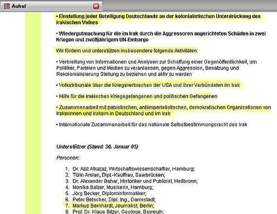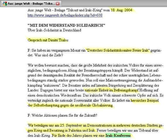 und zur "10 Euro"-Kampagne: ![]() Das von einem Sozialdemokraten geführte Verfassungsschutzamt des Landes Nordrhein-Westfalen war 2004 auf das DSkFI aufmerksam geworden, wie unser Screenshot aus der online-Ausgabe seines Berichtes zeigt, der auch auf den engen Zusammenhang der "10 Euro"-Kampagne mit dem DSkFI hinwies (allerdings das Euro-Zeichen noch nicht online hinbekam): (Screenshot von der Internet-Seite des nordrhein-westfälischen Innenministeriums mit dem online-Bericht 2004 des Landesverfassungsschutzes NRW.) Auf der DSkIF-Webseite wurde unter dem von Bernhardt unterzeichneten Afghanistan-Aufruf auch für ein Seminar mit den früheren MfS-Funktionären Rupp und Raussendorff geworben, auf dem die Bernhardt-Verbündeten politisch geschult wurden: ![]() Auf der DSkIF-Webseite wurden auch Bernhardts und Jelpkes Angriffe auf die Berliner Polizei verbreitet, nachdem diese eine Veranstaltung mit einem irakischen Verbündeten dieser Szene und Befürworter terroristischer Anschläge auf die irakische Polizei verhindert hatte. Der gelb gekennzeichnete "junge Welt"-Artikel "Polizei erteilte Redeverbot" ist von Bernhardt geschrieben (siehe weiter unten): ![]() ![]() Weshalb die Polizei diese pro-terroristische Propagandaveranstaltung des DSkFI verbot, zeigt sich in einem weiteren Text der Gruppe: ![]() Das alles und noch viel mehr kann man bei einer einfachen Google-Recherche zu Bernhardts Namen, den man in der Suchfrage der Schnelligkeit wegen vielleicht noch mit dem Stichwort "Irak" oder "irakischer Widerstand" verbindet, im Internet erfahren, öffentlich und für jedemann und -frau, auch für Bernhardts Interviewpartner/innen, jederzeit zu sehen. Wir haben Auszüge unserer Google-Anfragen separat dargestellt. "junge Welt"-Terrorpolitiker und pro-terroristischer "Journalist" Dass die Zeitung "junge Welt" in Verfassungsschutzberichten des Bundesinnnenministers als pro-terroristisch erwähnt wird, ist allgemein bekannt. Dass Bernhardt, dem die Extremisten-"Ehre" einer öffentlichen Verfassungsschutzerwähnung bisher nicht gewährt wurde, seine eigenen pro-terroristischen Propaganda-Aktionen direkt mit seiner "journalistischen" Tätigkeit für die "junge Welt" verbindet, kann also nicht erstaunen. So finden sich in der "jungen Welt" immer wieder Artikel, die er dort über seine Kumpane geschrieben hat, bzw. Interviews, in denen er sie zu Wort kommen lässt. Der oben auf der DSkFI-Webseite erwähnte und verlinkte Artikel Bernhardts gegen das polizeiliche Verbot der DSkFI-Veranstaltung in Berlin stand in der "jungen Welt", wie das Archiv der Zeitung noch im März 2009 zeigte: ![]() Der von Bernhardt hier verteidigte Awni Al Kalemji ist seit langem als reisender Terror-Propagandist bekannt. Im Interview mit dem ARD-Magazin "panorama" im Dezember 2003 hatte sich dieser von Bernhardt und seinem DSkFI im Jahr 2006 verteidigte Funktionär der "Irakischen Patriotischen Allianz" Awni Al Kalemji, den die Berliner und die Hamburger Polizei gegen Bernhardts und Jelpkes Protest nicht sprechen ließ, sowohl für die Zusammenarbeit mit den terroristischen Nachfolgern Saddam Husseins in dessen nun illegaler Ba'ath-Partei und ihrem "militärischen" Arm von Mördern und Folterern ausgesprochen als auch für Terroranschläge gegen alle Menschen, die von diesen Leuten zu "Kollaborateuren" der USA, Israels und nun wohl auch der deutschen Bundeswehr definiert werden, insbesondere gegen die "Kollaborateure" der irakischen Polizei: ![]() Awni Al Kalemji sagte hier laut "panorama": "Wenn man die Besatzer schlagen will, gibt es nur einen Weg: einen Guerilla-Krieg, bewaffneten Kampf. Die Leute, die mit der Besatzung kooperieren, etwa Polizisten, alle diese Leute sind Ziele für uns." Auf den Fernsehbericht, der auch im April 2009 noch online auf der Internetseite von "panaroma" angesehen werden kann und in dem sich auch die Bernhardt-Mittäter Guilliard und Zmrzly in Interviews für die Unterstützung irakischer Terroristen aussprechen und, gehen wir weiter unten noch ausführlich ein. Im "junge Welt"-Interview ließ Bernhardt zum Beispiel den Mitbegründer des DSkFI Dimitri Tsalos zu Wort kommen, wie das aktuelle "junge Welt"-Archiv zeigt, bei dem man freilich erst bezahlen muss, bevor man die Terror-Propaganda lesen darf: ![]() Bernhardts "junge Welt"-Interviewpartner und DSkFI-Mitbegründer Dimitri Tsalos ist wiederum der Domaininhaber und Administrator der Internetseite des "Initiativ e.V." aus Duisburg, wie ebenfalls eine aktuelle Denic-Abfrage des BIFFF... zeigt, und damit der Administrator der Webseite der "10 Euro"-Kampagne mit Bernhardts Namen als Unterstützer und all ihrer Internetlinks in das Netz des internationalen Terrorismus (siehe unten). Nur wenige Personen organisieren in Deutschland die Propaganda, die "panorama" auszugsweise zeigte, und Bernhardt ist eine der wichtigsten, weil er als "Journalist" auftritt und auch an prominente Politiker/innen herankommt; das hatte "panorama" im Dezember 2003 im Gegensatz zum BIFFF... nicht bemerkt. Je weniger Beteiligte die Terror-Propaganda organisieren, desto schneller können sie sich koordinieren, auch beim An- und Abschalten von Webseiten und Internetlinks. Bernhardts terrorpolitischer Journalismus funktioniert auch umgekehrt. Dann interviewt er zuerst jemanden zum Beispiel für die "junge Welt", der mitteilt, man wolle eine Konferenz zum Irak abhalten, und anschließend organisiert Bernhardt gemeinsam mit Guilliard, MfS-Raussendorff und anderen Bekannten aus der "10 Euro"-Szene die Konferenz. Wir zeigen unten noch einmal einen anderen Screenshot desselben Bernhardt-Tsalos- Interviews aus der "jungen Welt" vom 18. August 2004, das wir oben im "junge Welt"-Archiv gezeigt haben, mit der Konferenz-Ankündigung und Bekenntnissen zum bewaffneten "Befreiungskampf", an die sich Bernhardts Einladung zum Vorbereitungstreffen für die Konferenz mit der Kontakt-E-Mail-Adresse des DSkFI auf Zmrzlys Internet-Domain "freeiraq.de" anschließt: .![]() ![]() Geschickt gemach