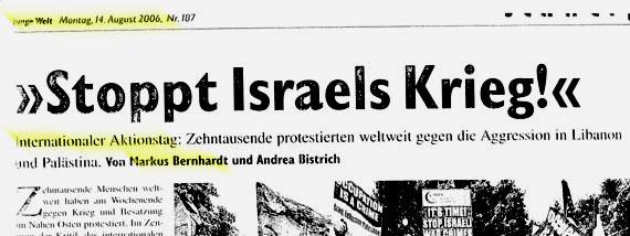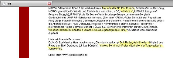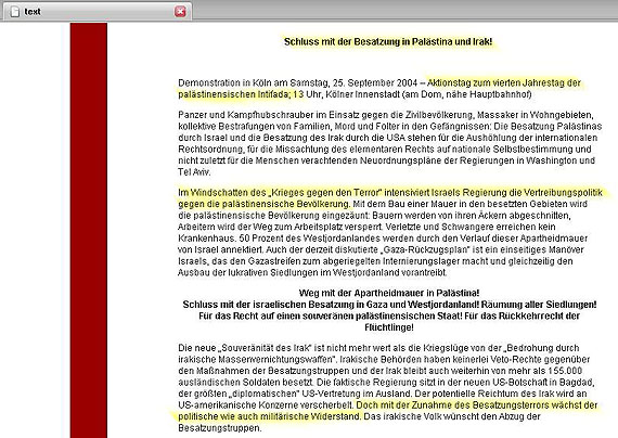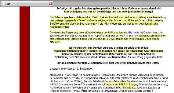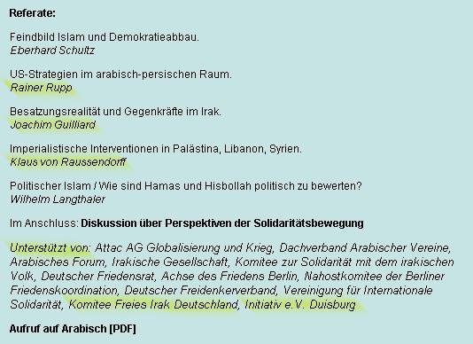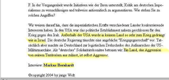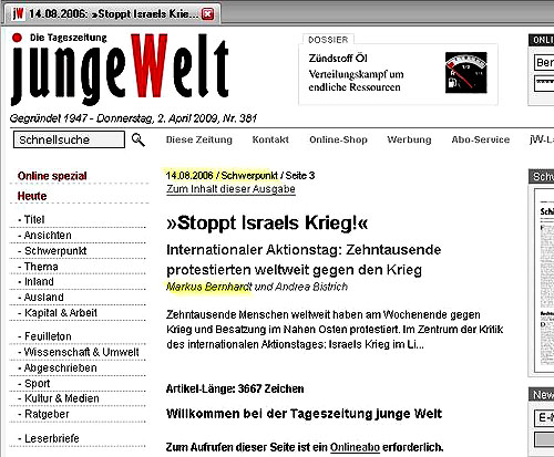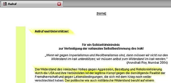 Selbstverständlich hat Bernhardt die "Plattform", das Gründungsdokument des DSkFI, über das er dann in der "jungen Welt" als "Journalist" berichtete, auch selbst unterzeichnet; und auf der Unterstützerliste sind wieder etliche Namen derer anzutreffen, die auch die oben und unten dargestellten anderen pro-terroristischen Aufrufe mit unterzeichnet haben, wie zum Beispiel die vormaligen MfS-Leute Rupp und Raussendorff, Tsalos, und Zmrzly von der "10 Euro"-Kampagne (siehe weiter unten). Wie man an dem kleinen rot-schwarzen Quadrat links neben der Kopfzeile "Freier Irak" auf unseren Screenshots unten sieht, haben wir uns diese Seite hier zur Abwechlung einmal mit Hilfe des Internet-Archivs "Wayback Machine" Mitte April 2009 angeschaut, nachdem die Webseite "freeiraq.de" zur Zeit von Webseiten-Administrator Zmrzly offline geschaltet ist: ![]() Klickt man auf der archivierten DSkFI-Webseite oben auf "Plattform & Unterstützer", kommt man zu dem "Aufruf" mit der Namensliste (unten): ![]() ![]() ![]() ![]() Pro Hamas und contra Israel Bemerkenswert: Während Berlins Innensenator Erhart Körting - übrigens bis zum Jahr 2005 selbst ein eifriger Bernhardt-Interviewpartner in der "jungen Welt" - erst kürzlich publikumswirksam von der Bundesregierung ein Hamas-Verbot forderte, plaudert sein Chef Wowereit mit dem Hamas-Unterstützer Bernhardt im "Box"-Interview. Denn auch beim "Intifada"-Tag, der weltweit vom iranischen islamistischen Terrorregime und seinen Handlangern, wie der Hamas, die die "Intifadas" gegen Israel organisierte, veranstaltet wird, und den Demonstrationen gegen Israel ist Bernhardt dabei. Die Gruppe "Irakkoordination Deutschland", die personell weitgehend mit den anderen Gruppen identisch ist, mischt hier ebenfalls mit. Die "Intifada"-Aufrufe, die Bernhardt unterschrieb, sind zur Zeit gerade mal nicht online (jedoch ebenfalls beim "Wayback Machine"-Internet- Archiv gespeichert und anzusehen), waren es aber noch Anfang April 2009, bevor Zmrzly auch diese Seiten mal eben abschaltete. Unsere Screenshots sind von Anfang April 2009, als dies alles noch unter der Adresse "irakkordination.de" online war, auch wenn die anti-israelischen Demos, zu denen Bernhardt hier aufruft, schon ein paar Jahre zurück liegen. Hier unten die Version für die Demo 2004 von der Webseite des DSkFI, "freeiraq.de". In der Spalte links haben wir einen Link zur separaten Darstellung von Texten von der Webseite der "Irakkoordination Deutschland" mit den Aufrufen für anti-israelische Demonstrationen in den Jahren 2005 und 2006, die Bernhardt ebenfalls unterschrieb, plaziert. ![]() ![]() ![]() Neben dem "Initiativ e.V." und den "Freunden" der Terrororganisation "PFLP" (Volksfront zur Befreiung Palästinas des George Habash, die Israel vernichten will, zahlreiche Terroranschläge auf Flugzeuge - darunter 1968 den ersten auf eine Maschine der israelischen Fluggesellschaft El-Al - verübte und 1977 die Flugzeugentführung der Lufthansa-Maschine "Landshut" nach Mogadischu zur Freipressung der RAF-Terroristen mit organisierte und mit durchführte) als Unterzeichnern fällt auf, dass auch die pro-Pädophilie-Gruppe "whk" und ihre Mitglieder Dirk Ruder (ein früherer "Box"-Kolumnist, der ebenfalls den "10 Euro"-Aufruf unterschrieb) und Astrid Keller (ebenso bei "10 Euro" dabei) neben Bernhardt, der ebenfalls zum "whk" gehört (siehe unten), als die wenigen Personen-Unterstützer dieses anti-israelischen Aufrufs genannt sind. Auch hier konnte Bernhardt seine Israel-Feindschaft wieder zusätzlich in der "jungen Welt" als "Journalist" ausleben. In der Hamas-Zeitung "junge Welt" schreiben auch die Hamas-Führer Haniya und Meschaal als Autoren. Allerdings muss man auch hier erst Geld bezahlen, bevor man im online-Archiv den Bernhardt-Artikel über eine weitere anti-israelische Demonstration lesen darf: ![]() Glücklich, wer sich von diesem Bernhardt-Artikel rechtzeitig eine Fotokopie gesichert hatte, auf der man auch muslimische Halbmonde erkennen kann: ![]() Schlecht getarnt als "Zitat" der Demonstranten auf einer der vielen anti-israelischen Aufmärsche, zu denen der "Journalist" Bernhardt in den Jahren zuvor selbst mit aufgerufen hatte! (Vgl. die Texte unter dem Link zu Auszügen aus der Webseite der "Irakkoordination Deutschland" in der linken Spalte oben.) Während Körting sich noch im Januar 2009 gegen derartige Hamas-geführte Demonstrationen aussprach und der "Berliner Morgenpost" sagte: "Die Unterstützung der Hamas in Deutschland durch Demonstrationen soll die Raketenangriffe auf israelische Bürgerinnen und Bürger rechtfertigen und die Hamas ermuntern, weiter Raketenangriffe vorzunehmen", und eine derart offenkundige Unterstützung von terroristischen Anschlägen, so die "Berliner Morgenpost" in indirekter Rede weiter Körting zitierend, sei mit der öffentlichen Ordnung der Bundesrepublik Deutschland nicht vereinbar, macht Wowereit einem solchen Hamas-Unterstützer wenig später die Tür weit auf. Der Aufruf "10 Euro für das irakische Volk im Widerstand": Bernhardt als Al Qaida-Propagandahelfer Der zweifellos wichtigste Aufruf, für den Bernhardt tätig wurde, eifrig Geld und Unterstützer-Unterschriften sammelte, und der auch die am weitesten reichenden direkten Internet-Verbindungen in den internationalen Terrorismus aufweist, ist die "10 Euro"-Kampagne des Duisburger "Initiativ e.V.", der auch aktuell online ist. Wählt man die Internetseite des "Initiativ e.V." an, kann man sich mit wenigen Klicks zu den Propaganda-Schriften Osama Bin Ladens und den Aufrufen der Saddam-Hussein-Anhänger, Israel zu vernichten, durchklicken. Frecherweise nennt der "Initiativ e.V." seine Internet-Domain, die Bernhardts "junge Welt"-Interviewpartner und Mitstreiter im DSkFI Dimitri Tsalos besitzt und administriert, "antifakomitee". Wählt man die Webseite des Duisburger Vereins an und klickt auf "Kampagne" (unten, gelbes Kreuz links), wird man sofort zum Einleitungstext für die "10 Euro"-Kampagne, "Free Iraq - Das irakisc