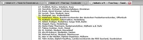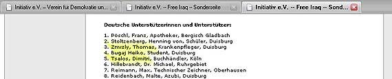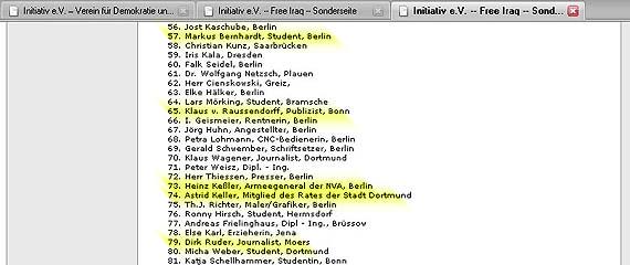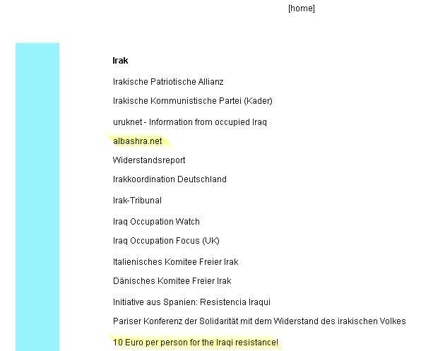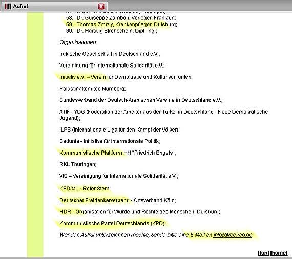 ![]() Vergrößerung der Unterzeichnerliste des obigen Aufrufs: ![]() Fortsetzung der Unterzeichnerliste: ![]() Sowohl die Internetadresse "freeiraq.de" als auch "irakkordination.de" sind nach ersten BIFFF...-Veröffentlichungen über die Zusammenhänge mal online, mal offline; beide Domains gehören gemäß einer aktuellen Denic-Abfrage des BIFFF... dem "10 Euro"- und "Initiativ e.V."-Aktivisten und Bernhardt-Interview-Partner für die "junge Welt" (siehe unten) Thomas Zmrzly aus Duisburg, einem der radikalsten und eifrigsten Befürworter terroristischer Gewalt in dieser Szene. Zmrzly schaltet als Web-Administrator die Webseiten auch an oder ab, je nachdem, was gerade tagespolitisch gebraucht wird. Zur Zeit der Verbreitung des Bernhardt-Wowereit-Interviews scheint "Abschalten" erst einmal nützlich zu sein. Aber das Internet-Archiv "Wayback Machine", auf dem die Texte dieser Domains weiterhin zu lesen sind, haben sie noch nicht abschalten können! Mit der in der Unterstützerliste genannten "Irakkoordination Deutschland" und dem "Initiativ e.V.", der den pro-terroristischen, Al Qaida-nahen Aufruf "10 Euro für das irakische Volk im Widerstand" initiierte, arbeitet Bernhardt ebenfalls seit Jahren zusammen (siehe unten; der "10 Euro"-Aufruf ist weiterhin online); der in der Unterstützerliste oben genannte Arnold Bruns aus Bonn ist der Verleger von Bernhardts Buch "Schwule Nazis", in dem Bernhardt den "Lesben- und Schwulenverband Deutschlands" (LSVD) wegen dessen Kritik an Homophobie und antischwuler Gewalt unter muslimisch-arabischen Jugendlichen als rassistisch und "Schwule Nazis" darstellt (siehe unten); auch Mitunterzeichner Joachim Guilliard ist bei fast allen pro-terroristischen Aufrufen zur "Irak-Solidarität" dabei (siehe unten). Das DSkFI unterstützt auch selbst die "10 Euro"-Kampagne, wie ein Klick bei "Links" (erstes DSkFI-Bild linke Spalte) zeigt; auch das pro-Saddam-Terrornetzwerk "albasrah.net" (siehe unten) wird hier verlinkt: Bernhardts DSkFI verlinkt sich zum