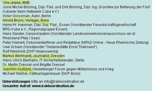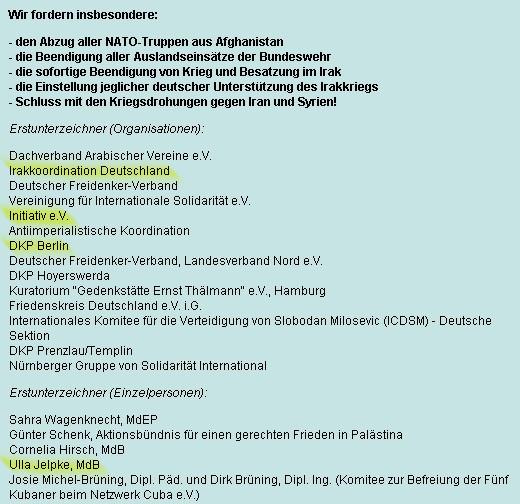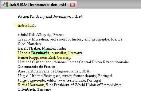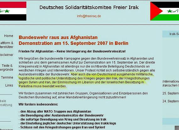zur Unterstützung des "bewaffneten Kampfes": ![]() ... ![]() ![]() Das am Anfang des Screenshots vor dem Aufruf genannte "albasrah.net" ist eine Internet-Kommunikationsplattform extrem antisemitischer irakischer Terroristen, die sich als Anhänger Saddam Husseins und seines Regimes verstehen (siehe weiter unten). Zu den in der Unterzeichnerliste zuerst aufgeführten "Pro Iraqi and Arab Solidarity Associations" zählt auch das "Deutsche Solidaritätskomitee Freier Irak" (DSkFI; oben englisch angeführt als "Free Iraq Committee Germany"), für das Bernhardt ebenfalls Aufrufe unterschreibt und "junge Welt"-Artikel schreibt, unter anderem auch gegen den Bundeswehreinsatz in Afghanistan und gegen Israel. Insbesondere die Verknüpfung von Bernhardts Einsatz für terroristische Akte gegen "Besatzer" (oben) mit der Agitation des DSkFI gegen den Bundeswehreinsatz in Afghanistan (unten) macht die politische Brisanz deutlich, die Wowereits Bernhardt-Interview, auch unabhängig von seinem Inhalt, tatsächlich hat. Die Verbindung "Irak-Afghanistan" wird in den Aufrufen selbst gezogen. Liest man beide Bernhardt-Aufrufe (hier oben und unten abgebildet) gemeinsam, drängt sich uns der Schluss auf, dass auch Terroraktionen gegen Bundeswehrsoldaten in Afghanistan gerechtfertigt sein sollen. Gleichzeitig hat Bernhardt offenbar freien Zugang zur Berliner Senatskanzlei und kann immer wieder prominente deutsche Politiker/innen interviewen und sich anschließend mit dem Hinweis auf seine prominenten Partner/innen auch im Bezug auf seine pro-terroristischen Aktivitäten als seriös darstellen; so "schwimmt man wie ein Fisch im Wasser", wie es in einem Text der "10 Euro"-Kampagne des "Initiativ e.V." heißt, eine geradezu teuflische Strategie der Verbreitung von Terrorismus-Propaganda, zu der Bernhardt nun mit Wowereit auch erstmals einen deutschen Regierungschef gewinnen konnte. Bernhardt beim DSkFI gegen die