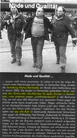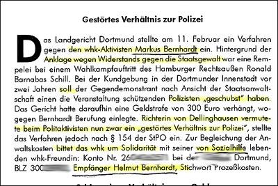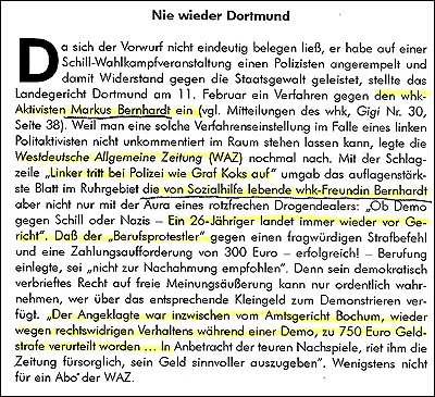 der pro-terroristische DKP-Schläger greift den White-Collar-Schwulen an. Mit Glietschs Unterstützung? Bei dem Mann links handelt es sich um Jörg Litwinschuh, Pressesprecher der überwiegend aus Steuergeldern finanzierten Deutschen Aidshilfe e.V. und im Nebenjob mit Bernhardt und dem neuen "Folsom Europe e.V."-Vorsitzenden Alain Rappsilber Redakteur des Berliner "Box"-Büros. Bernhardts langjährige "sexualpolitische" Heimat, die pro-Pädophilie-Gruppe "whk" und ihre Zeitschrift "Gigi", hatten schon vor ein paar Jahren den Gewalttäter Bernhardt gewürdigt, nachdem dieser wiederholt wegen Demonstrationsdelikten vor Gericht gestanden hatte. Wir zeigen hier Scans aus "Gigi"-Artikeln, in denen Bernhardt sogar als Sozialhilfe-Betrüger gepriesen wird: das Soli-Geld für ihn sollte auf ein Konto überwiesen werden, auf das das Sozialamt keinen Zugriff hatte: Abgeführt - Festnahme des
