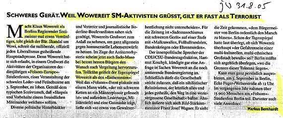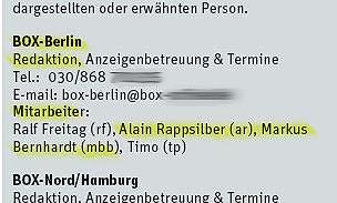 Seite 115 ff.: ![]() Terror-Bernhardt und das "Folsom Europe e.V."-Vorstandsmitglied Alain Rappsilber gemeinsam im "Box"-Impressum als Berliner Lokalredakteure der "Box" Bernhardt hat seine Sympathie für den Gewaltsex-Verein "Folsom Europe e.V." immer zur Schau getragen. Der Debatte um das von Wowereit seit Jahren unterstützte "Folsom Europe"-Straßenfest widmet er in seinem "Schwule Nazis"-Buch ein Kapitel; die Kritiker und Gegner der Gewaltsexualität sind für ihn dabei wohl wieder "Nazis", wie der Buchtitel suggeriert. Vorher schon hatte er in der "jungen Welt" für das Straßenfest geworben und dabei selbst die Verbindung zum Terrorismus aufgemacht -- soll niemand sagen, nichts gewusst zu haben: ![]() Wie eng die Verbindungen zu Wowereit tatsächlich sind, zeigt das Impressum der "Box"-Hefte. Hier werden für "Box Berlin", also quasi als Berliner Lokalredakteure der Zeitschrift, sowohl Bernhardt als auch das langjährige Vorstandsmitglied des seit Jahren von Wowereit gegen alle Einwände massiv geförderten "Folsom Europe e.V.", Alain Rappsilber, aufgeführt. Der "Folsom Europe e.V. gibt selbst an, "Box" sei sein "Medienpartner"; tatsächlich ist die Zeitschrift sein einziger "Medienpartner". Der Vorstand des "Folsom Europe e.V." hat nach seinen eigenen Angaben gegenüber dem Berliner Vereinsregister nur vier Mitglieder, eines ist Rappsilber, ein weiteres der von Wowereit im Berliner Abgeodnetenhaus gepuschte Daniel Rüster, ein dritter der Kölner "Box"-Redakteur Jürgen Rentzel: jahrelang zwei "Box"-Redakteure im vierköpfigen "Folsom Europe"-Vereinsvorstand. Ausschnitt aus dem Impressum eines