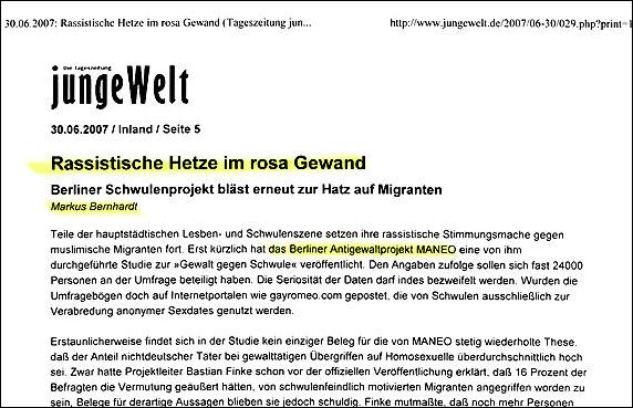 Unten: Und selbstverständlich hatte Bernhardt seine Anti-"Maneo"-Hetze vorher auch schon in der "jungen Welt" platziert: ![]() Schon eine "Box"-Ausgabe früher