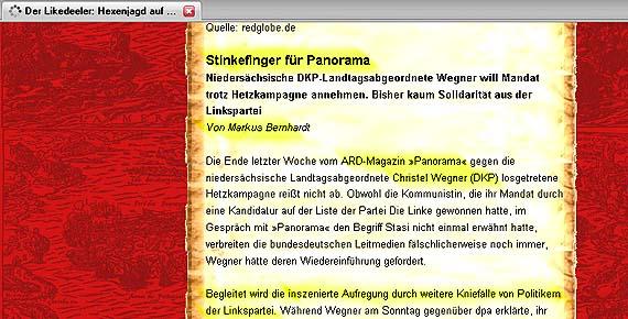 Guilliard sagt in dem "panorama"-Interview unter anderem: "Widerstand, auch militärische Aktionen gegen die Besatzer, ist selbstverständlich legitim. Das hat mit Terrorismus im engeren Sinne nichts zu tun. ... Ich denke, die Friedensbewegung sollte genau für dieses Recht der Iraker eintreten, und was die Iraker tun können, was ich auch für vernünftig halte, ist, den Besatzungstruppen entsprechende Verluste zuzuführen." Zmrzly sagt: "Wir sammeln das Geld, um das irakische Volk im Widerstand zu unterstützen in seinem legitimen Kampf gegen die Besatzung. Wir möchten im kommenden Jahr eine Delegation in den Irak schicken." Und nachdem in diesem "panorama"-Bericht ein weiterer "10 Euro"-Mann gesagt hat, das Geld sei für die "Irakische Patriotische Allianz" bestimmt, kommt deren Mitgründer Awni Al Kalemji mit dem eindeutigen Satz zu Wort: "Wenn man die Besatzer schlagen will, gibt es nur einen Weg: einen Guerilla-Krieg, bewaffneten Kampf. Die Leute, die mit der Besatzung kooperieren, etwa Polizisten, alle diese Leute sind Ziele für uns." Es ist derselbe Awni Al Kalemji, den Bernhardt - siehe oben - in seinem "junge Welt"-Artikel über das polizeiliche Verbot der DSkFI-Veranstaltungen, auf denen Awni Al Kajemji sprechen sollte, durch die Berliner und Hamburger Polizei so vehement verteidigte. Was also mögen die Bundeswehrsoldaten in Afghanistan und die von deutschen Hilfskräften dort ausgebildeten afghanischen Polizisten für diese Szene um Bernhardt sein? Der Schluss ist einfach: für den Wowereit-Interviewer Bernhardt sind sie Terrorziele. Auch Bernhardt selbst hat sich mit dieser "panorama"-Sendung beschäftigt, auf der Webseite der Bonner "Friedenskooperative", die zu den Zeiten der großen Bonner Friedensdemonstrationen zu Anfang der 80er Jahre als DKP-nah und DDR-finanziert galt: ![]() ![]() In dem Artikel lässt Bernhardt nicht nur erkennen, dass er offenbar von Anfang an bei der "10 Euro"-Kampagne dabei war, die das Geld direkt an die terroristische "Irakische Patriotische Allianz" und ihren Mitbegründer, den Befürworter von Polizistenmorden Awni Al Kalemji weitergeben wollte; er bekennt auch die Nähe zum MfS-Funktionär Rainer Rupp, der im Gegensatz zu seinem MfS-Kollegen Raussendorff den "10 Euro"-Text nicht unterzeichnet hat, aber die Kampagne in der "jungen Welt" als Autor publizistisch förderte. Und in der "jungen Welt" hat der "Journalist" Bernhardt dann auch seinen "10 Euro"-Kompan Thomas Zmrzly über die "panorama"-Sendung interviewt. Genialer Fisch im Wasser? Hier ein Ausschnitt aus einem Ausdruck der Internet-Version des Bernhardt-Zmrzly-Interviews: ![]() Wir sehr für diese Leute "panorama" zum Gegner geworden ist, zeigt auch Bernhardts Artikel über die DKP-Landtagsabgeordnete Christel Wegner aus Niedersachsen, die auf der Liste der "Links"-Partei in den Landtag eingezogen war und sich laut Presseberichten für den Aufbau eines neuen Stasi-Überwachungsapparates ausgesprochen haben soll, was "panorama" ebenfalls ans Licht gebracht hatte. Für das ARD-Fernsehmagazin hat der Wowereit-Interviewer aus der DKP, Markus Bernhardt, nur eine Beleidigung übrig: ![]() Tante Semra im Leberkäseland Das alles ist online im Internet, man muss es nur zusammen suchen. Eine Aufgabe für den Berliner Verfassungsschutz, der dies alles verschläft? Angesichts dessen erstaunt es doch sehr, welche Interviewpartner sich derselbe Markus Bernhardt einfangen kann. Es sei an den Skandal erinnert, den das BIFFF... schon vor Jahren bekannt machte: dass Berlins Innensenator Erhart Körting mehrfach und über Jahre hin ein bevorzugter Interviewpartner Bernhardts in der "jungen Welt" war, wie das Archiv der Zeitung noch heute zeigt, zu einer Zeit, als Bernhardt bereits eifrig in Sachen Terrorismus-Unterstützung agierte. Die Berliner CDU nutzte Körtings lange Bernhardt-Bekanntschaft zu einer schwammigen parlamentarischen Anfrage über das BIFFF...; Körting konnte ausweichen, weil die CDU schlecht informiert war. Mit dem Wissen um Bernhardts Hintergründe hätte sie damals Körting leicht zu Fall bringen können. Eine weitere bemerkenswerte