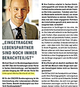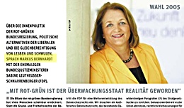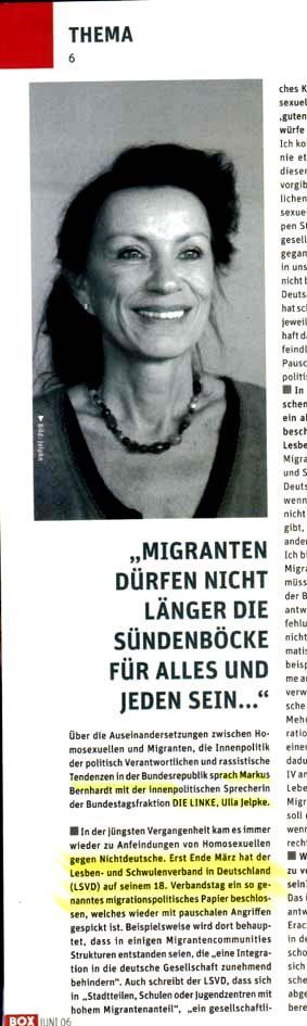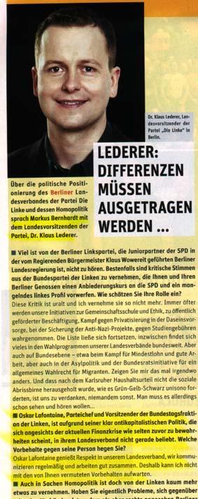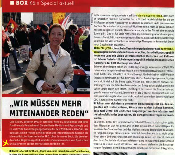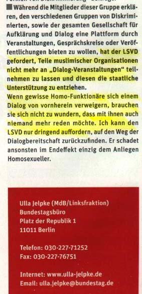 | Link zu Auszügen aus dem Urteil des Landgerichts Berlin gegen die Zeitschrift "Box" und zugunsten eines BIFFF...- Textes über die Verbindungen von "Box" zu Terrorismus-Sympathisan- ten, das den Wowereit-Interviewer Markus Bernhardt namentlich nennt: HIER KLICKEN Bernhardt-Interview mit Wowereit in "Box" vom April 2009 (Ausschnitt): ![]() Bernhardt-Interview mit Jelpke in "Box" vom Juni 2006, in dem Jelpke offen dem LSVD drohte: ![]() Sinn des Bernhardt-Interviews mit Jelpke in "Box" war es einzig, Bernhardts seit Jahren andauernde Hetze gegen den LSVD, den er wegen dessen Kritik an der Homophobie unter Muslimen und der Prügelattacken einiger arabischer Jugendlicher gegen Schwule für "rassistisch" hält (als wären Muslime eine Rasse, so wie die Nazis die Juden zur Rasse erklärten!), mit der Zustimmung einer Bundestagsabgeordneten zu adeln. Jelpke, deren offizielle Bundestagstags- adressen Bernhardt am Ende angab, erfüllte ihrem politischen Ziehkind aus gemeinsamen "junge Welt"-Zeiten nicht nur prompt den Wunsch, sondern drohte Schwulenaktivisten des LSVD sogar, ohne dass Bernhardt oder "Box" dies zurück- wiesen. Wenn Ihr nicht mehr reden wollt, dann wird eben nicht mehr geredet, sondern ..., dann braucht Ihr Euch nicht zu wundern, wenn ...: ![]() Bernhardt-Interview mit Lederer in "Box" im November 2008: ![]() "Respekt" für Lafontaine, der Irans Möchte-gern-Israel-Vernichter Achmadinedschad besuchen wollte: das ist Lederers "Box"-Botschaft. Außerhalb des Schutzraumes einer Gewaltsex- Zeitschrift gibt er sich als Israel-Freund, hier aber parliert er mit dem erklärkten Israel-Gegner Bernhardt gerne mal offen über den lieben Oskar: "Wir kommunizieren regelmäßig und arbeiten gut zusammen." Hinter den Kulissen läuft eben mehr, als die Lafontaine-Partei der Bevölkerung zumuten mag. Eine Auswahl weiterer Interviewpartner Bernhardts in "Box" zeigen wir hier in Ausschnitten. Ob die MfS-Reste die damals so erfolgreiche "Methode Romeo" abgewandelt und weiter entwickelt haben? Die Frage steht im Raum: Warum ließen sich FDP-Politiker und ein CDU-Hinterbänkler mit einem DKP-Agitator auf ein freundliches Gespräch ein? Es ist denkbar, dass die MfS-Agenten Rupp und Raussendorff dem anfangs unerfahrenen Bernhardt hier hilfreich zur Seite standen mit dem Rat: Suche Dir aus jeder Bundestagspartei ein paar Dumme, dann wirst Du unangreifbar, dann kann keine Partei losschreien gegen die andere, weil alle gleichermaßen verwickelt sind. Der "bildungspolitische Sprecher" der CDU-Fraktion im Berliner Abgeordnenhaus Sascha Steuer im "Box"-Gespräch mit Terror-Bernhardt: ![]() Der offen schwule CDU-Politiker Steuer ist eine Zentralfigur im CDU-internen Streit in der Parteigliederung Berlin-Neukölln und gilt als Henkel-Mann, als wichtiger Verbündeter des CDU-Landeschefs Frank Henkel. Steuer fiel auch durch Alarmismus gegen Migranten auf, die er für die angeblich wachsende Zahl von Angriffen auf Homosexuelle pauschal verantwortlich macht: "In meinem Freundeskreis wird bereits diskutiert, ob man in der Öffentlichkeit noch Händchenhalten oder sich einen Abschiedskuss geben kann", schrieb er im November 2008 im "Tagesspiegel". "Integration ist vor allem eine Verpflichtung und Aufgabe der Migranten", meinte er dort; wer dem nicht folge, der "hat in Deutschland keinen Platz" und "sollte sich entscheiden, unser Land zu verlassen." Anschließend sagte Steuer zur Reaktion auf seine Pauschalisierungen dem "Tagesspiegel": "Ich habe sehr viele positive Kommentare bekommen, aber nicht von Migranten." Weiter pauschalisierend behauptete er hier, "Migranten" schlechthin hätten "ein Problem mit Homosexualität." Deshalb müsse die Politik jetzt "die (!) Migranten in eine Entscheidungssituation bringen, notfalls auch provozieren." Der ehemalige Fraktionsvorstand der FDP-Fraktion im Berliner Abgeordnetenhaus Rainer-Michael Lehmann (er hat 2009 nicht wieder für dieses Amt kandidiert) im "Box"-Gespräch mit DKP-Bernhardt: ![]() Im März 2010 wechselte Lehmann - bis 1989 Mitglied der DDR-Blockpartei LDPD und als Schriftsetter in der Druckerei des "Neuen Deutschlannd" technisch mitverantwortlich für den richtigen Inhalt der SED-Parteizeitung - von der FDP, für die ins Berliner Abgeordnetenhaus gewählt worden war, zur SPD. Wowereit hieß ihn herzlich willkommen. Die Berliner Vorsitzende der "Schwusos", der Gruppe der Schwulen und Lesben in der SPD, Kirstin Fussan, die Wowereits erstes Coming Out beflügelt haben soll, indem sie seine sexuelle Orientierung an die Presse ausplauderte, im "Box"-Gespräch mit Terror-Bernhardt: ![]() Der "Grünen"-Hinterbänkler aus dem Berliner Abgeordnetenhaus Thomas Birk, der so eine Art Ronald Reagan der Grünen gibt: als Schauspieler reüssierte er an Provinzbühnen, bevor er die politische Bühne betrat und in Berlin die Gewaltsex-Szene öffentlich unterstützte, im "Box"-Interview mit Bernhardt: Der Fraktionsgeschäftsführer der FDP-Bundestagsfraktion und frühere Staatsanwalt Jörg van Essen im "Box"-Gespräch mit Terror- und DKP-Bernhardt: ![]() Inzwischen wieder FDP-Bundesjustizministerin: Sabine Leutheusser-Schnarrenberger während ihrer Auszeit im Interview mit Bernhardt: ![]() Auffällig ist, dass es neben Politiker/innen der Partei PDS/Die "Linke" vor allem FDP-Politiker/innen waren, die Bernhardt für "Box" interviewen durfte, und die meist gleich mehrfach. Der Sprecher der FDP für Schwulen- und Lesbenpolitik, Michael Kauch, im April 2008 im "Box"-Interview mit Bernhardt: ![]() Der Herr über allem, Oskar Lafontaine, im "Box"-Gespräch mit Bernhardt: ![]() Mit Lafontaine, van Essen und Leutheussser-Schnarrenberger sprach Bernhardt sogar wiederholt für "Box". Link zu Auszügen unserer Google-Abfragen über Markus Bernhardt - der Terrorismus-Propagandist und seine Kontakte: HIER KLICKEN Link zu weiteren Informationen über die "Irakkoordination Deutschland", wo Bernhardt kaum verblümt ein "Recht" auf Terrorismus fordert, das letztlich die Vernichtung Israels bring