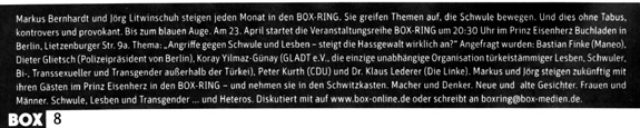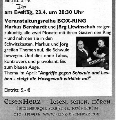 ![]() Zu der Diskussionsveranstaltung lädt "Box" mit ganz besonderen Bernhardt-Bildern ein, in denen sich dieser - nach allem wundert es nicht - selbst als Gewalttäter präsentiert. Gleichzeitig wird die Veranstaltung im schwulen Buchladen "eisenherz" mit einem Frontalangriff Bernhardts auf das Berliner Anti-Gewalt-Projekt "Maneo" angekündigt, das immer wieder die Prügeleien homophober muslimischer Migranten-Jugendlicher kritisiert hatte. "Maneo" gilt in Berlin als Vorzeigeprojekt gegen anti-schwule Gewalt. In demselben "Box"-Heft, in dem der Regierende Bürgermeister von Berlin mit Bernhardt parliert, greift derselbe Bernhardt ein paar Seiten weiter das schwule Vorzeigeprojekt "Maneo" massiv an. Was will uns Wowereit damit sagen? ![]() Oben: Ankündigung der