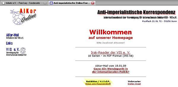 Bei der von "10 Euro" verlinkten "Antiimperialista" handelt es sich gewissermaßen um die Mutter aller deutschsprachigen pro-terroristischen Gruppen, deren Mitglieder auch in Berlin bei gewalttätigen Demonstrationen immer wieder mit dem Geschrei "Antiimperialista! Antiimperialista!" auffallen. Die Gruppe findet auf ihrer "10 Euro"-verlinkten Webseite eine originelle Antwort auf den Haftbefehl des internationalen Strafgerichtshofes in Den Haag gegen den Präsidenten des Sudan wegen dessen Beteiligung am Völkermord in Darfur: ![]() ![]() ![]() "Antiimperialistische Korrespondenz AIK" Mit dem "10 Euro"-Link zur "Antiimperialistischen Korrespondenz" kommt man zur Pensionärsbeschäftigung des früheren MfS-Funktionärs und DDR-Spions Klaus v. Raussendorff, der sich nach dem Absitzen seiner Haftstrafe nicht weiter nur mit Klebearbeiten beschäftigen mag. Ihn trifft man ja immer wieder in Bernhardts Umfeld. ![]() "junge Welt"