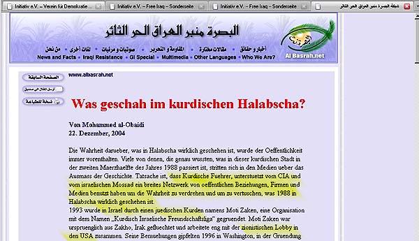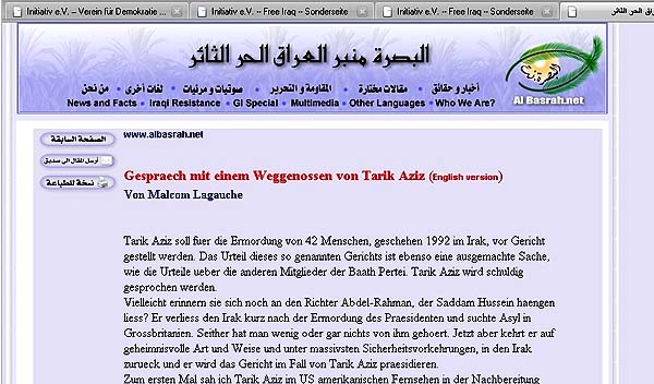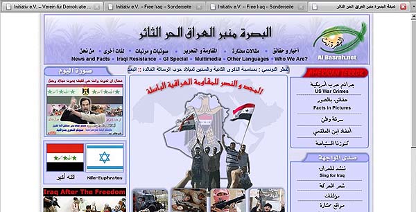 Der Link von der "10 Euro"-Webseite zu "Al Basrah Net" (gleich über dem zu "Jihad Unspun") verbindet zu einer weiteren antisemitischen Terrorgruppe der direkten Saddam-Hussein-Anhänger. Sie sind vor allem gegen die kurdische Bevölkerung des Irak gerichtet. Auf mehreren deutschsprachigen Unterrubriken der Webseite wird zum Beispiel behauptet, die Berichte über das Giftgas-Massaker Saddams gegen das kurdische Dorf Halabscha seien Erfindungen des israelischen Geheimdienstes Mossad. Offenbar sind sich die Unterstützer der "10 Euro"-Kampagne, inklusive des langjährigen "Box"- und "junge Welt"-Autors Bernhardt, nicht zu schade, sich mit der letzten antisemitischen Hetze zu verbinden. Im "Al Basrah Net" trifft es nun hauptsächlich die Kurden. ![]() Klickt man auf der Webseite auf die israelische Nationalfahne im Bild oben, wird einem weisgemacht, die neue irakische Regierung wolle dem Land und seiner Bevölkerung eine Flagge ähnlich der israelischen aufdrängen, weil die Betreiber von "Al Basra Net" die antisemitische Propaganda vertreten, die jetzige irakische Regierung sei aus Israel ferngesteuert. Die "10 Euro"-Unterstützer, inklusive Wowereit-Interiewer Bernhardt, sind sich für keine noch so schäbige antisemitische Hetze zu schade. Den Link zu "Al Basra Net" haben sie seit Jahren online. ![]() Auch dem soeben erst wegen seiner Menschenrechtsverbrechen von einem irakischen Gericht zu 15 Jahren Haft verurteilten Saddam-Getreuen Tarik Aziz wird hier gedacht, ein Text, der vor dem Aziz-Prozess geschrieben wurde, aber immer noch online ist: ![]() Beim "10 Euro"-Link zum "Al Basrah Net"