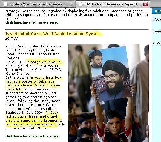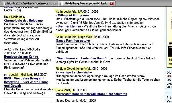 Beim "10 Euro"-Link zu der Gruppe "IDAO Iraqi Democrats Against Occupation" handelt es sich um Anhänger der Terrororganisation "Mahdi-Armee" des Schiiten-Predigers Muqtada Al Sadr, die auf die Unterstützung irre gewordener Sozialdemokraten in Europa setzen. Al Sadr galt zeitweise als der gefährlichste Terroristen-Führer im Irak, weil er große Menschenmassen zu organisieren vermag. Die IDAO warb in ihrer "10 Euro"-verlinken Webseite mit einem Foto, das ein irakisches Kind mit einem Bild des palästinensischen Hezbollah-Führers Hassan Nasrallah auf einer Kundgebung Al Sadrs zeigt, für eine Kundgebung in London, auf der der frühere britische Labour-Abgeordnete George Galloway sprechen sollte, der erst kürzlich wegen seiner Terrorismus-Kontakte ein Einreiseverbot nach Kanada erhielt. Die Galloway-Kundgebung sollte sich gegen Israel richten; bemerkenswert in der Überschrift sind die drei Pünktchen, die andeuten, das Isarel auch raus soll aus Israel! ![]() "Antikriegsforum Heidelberg" Beim "10 Euro"-Link zum "Antikriegsforum Heidelberg" handelt es sich um die Gruppe um den Terrorpropaganda-Multifunktionär Joachim Guilliard, der sich im "panorama"-Interview offen für bewaffnete Anschläge aussprach. Auf seiner Webseite sind etliche "junge Welt"-Größen zu sehen, darunter auch die heute offenbar auf der arabischen Halbinsel lebende frühere Bonner RAF-Unterstützerin Karin Leukefeld: ![]() "Antiimperialista"