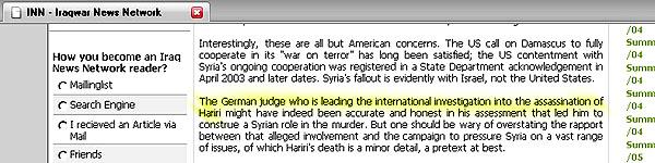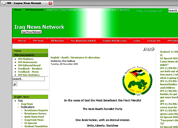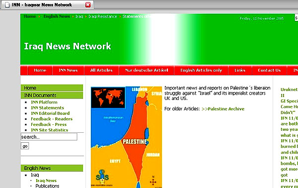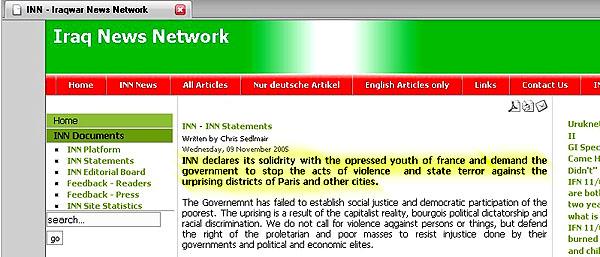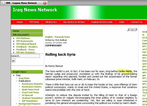 ![]() In Jerusalem steckt die pan-arabische Fahne der Ba'ath-Partei: ![]() Für die deutschen Terror-Freunde, die kein Englisch können: ![]() Besonders für Berliner Verhältnisse bedeutsam: Der Berliner Staatsanwalt Detlev Mehlis, der von den Vereinten Nationen beauftragt worden war, den Mord an dem libanesischen Politiker Rafik Hariri aufzuklären und zu dem Schluss kam, Syrien, das von der Ba'ath-Schwesterpartei regiert wird, sei Drahtzieher des Mordes gewesen, wird auf der INN-Webseite, mit der sich die "10 Euro"-Kampagne verlinkte, angegriffen und als Trottel hingestellt, der zwar gutmütig gewesen sein möge, aber naiv an den Fäden anderer gegen Syrien agitiere. Und dass diese Fäden vom israelischen Geheimdienst gezogen werden, ist für diese Leute glasklar: ![]() ![]() Bemerkenswert auch der Versuch, den Terrorismus aus dem Irak nach Europa zu tragen, indem sich das "Iraq News Net" mit den Brandstiftern in Frankreich solidarisierte, die zahlreiche Autos abgefackelt hatten. Das muss man wohl noch näher auf die Berliner Zustände zuschneiden: "Al Basrah Net"