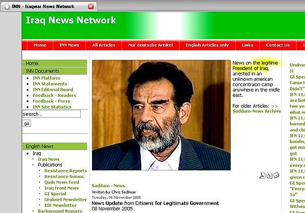 Der Link von der "10 Euro"-Webseite zur Webseite "Iraq News Net" ist ähnlich zu sehen. Hier sind jedoch die terroristischen Anhänger Saddam Husseins am Werke. Die Internet-Seite des "Iraq News Net" scheint zur Zeit nicht zu existieren, die Domain steht zum Verkauf. Wir haben in den vergangenen Jahren Screenshots von dieser Webseite gesammelt und können hier dokumentieren, mit welch aggressiven Antisemiten und Israel-Feinden sich die "10 Euro"-Kampagne verlinkt; dass die Unterstützer des Aufrufs es nicht bedauern, zeigt sich daran, dass der Link zum "Iraq News Net" aufrecht erhalten bleibt, auch wenn die Seite schon nicht mehr existiert. ![]() Hier hält man Saddam Hussein immer noch für den "legitimen Präsidenten des Irak": ![]() Besonders