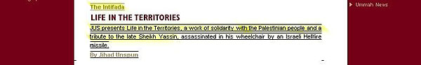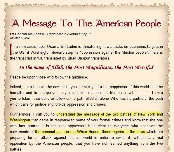 "Jihad Unspun" Der Link "Jihad Unspun" führt direkt zur antisemitischen Propaganda Osama Bin Ladens. Die Internet-Seite "Jihad Unspun", was in etwa "unzensierter Jihad" bedeutet, wird von einer kanadischen muslimischen Konvertitin betrieben und veröffentlicht neben "Siegesmeldungen" der irakischen Al Qaida-Terrorgruppe vor allem Hetzreden Bin Ladens gegen die Juden in aller Welt, die wie heilige Schriften auf besonderem Hintergrund präsentiert werden, Drohungen seines Mitstreiters Al Zawahiri gegen Deutschland und auch einen Solidaritätsblock für den im Jahre 2004 mit einem großen Artikel in der Gewaltsex-Zeitschrift "Box" geehrten schwulen "Taliban" John Walker Lindh, der in den USA wegen seiner terroristischen Aktivitäten im Knast sitzt. Man staunt zuerst, aber die inhaltliche Verbindung "Al Qaida-Box" ist enger als zunächst gedacht. ![]() ![]() Klickt man auf die Bildchen links, kommt man zu Abteilungen der "Jihad Unspun"-Seite mit den entsprechenden Texten. (Das funktioniert auf unseren Screenshots selbstverständlich nicht.) ![]() Gegen Israel gibt es bei "Jihad Unspun" eine Extraspalte mit Texten, die dort verlinkt sind, weiter unten gibt es einen Sonderteil der "Jihad Unspun"-Autoren aus Solidarität mit der Hamas, ihrem Begründer Yassin und der Intifada zum Anklicken: ![]() Breit kommt Osama Bin Laden zu Wort: ![]() In der Abteilung Bin Laden kann man "Interviews", "Statements" usw. anklicken und die antisemitische Hetze Bin Ladens als heilige Worte wie auf Pergament geschrieben lesen: ![]() ![]() ![]() Al Zawahiri droht gegen Deutschland: ![]() In
