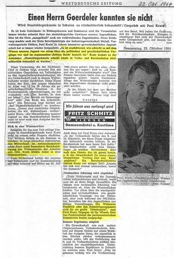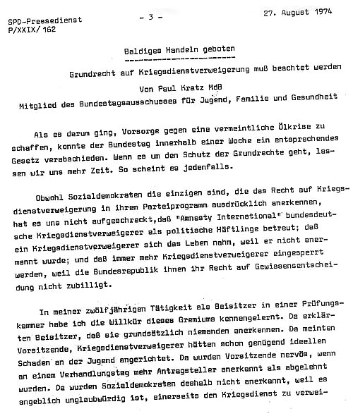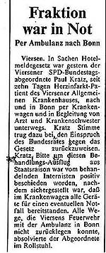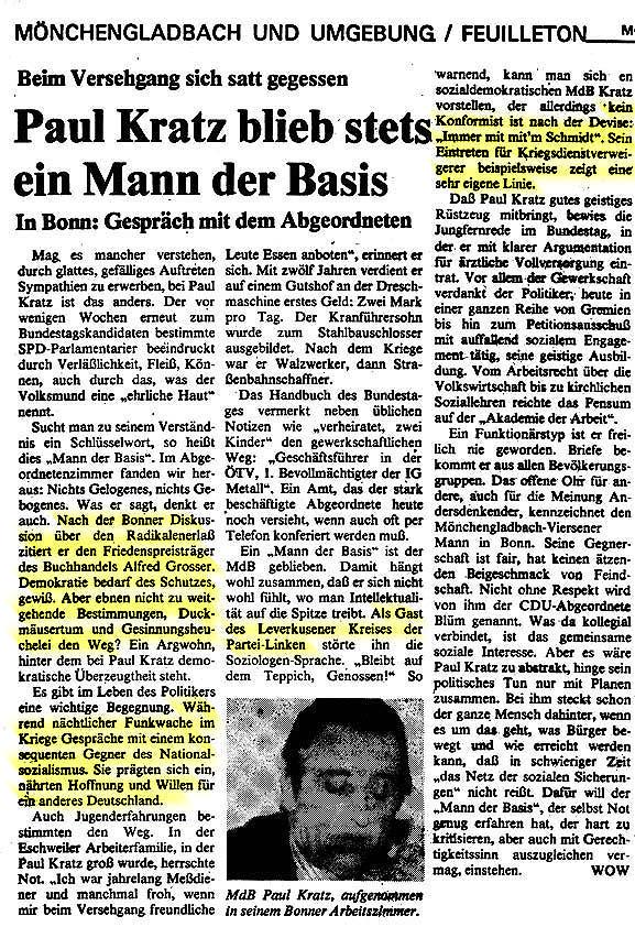 ![]() ![]() (Oben: Artikel der "Rheinischen Post" 1974) Sie haben jetzt viel über andere erzählt, aus der Vergangenheit. Wie ging es denn weiter mit Ihrem Antifaschismus in der SPD? Tja, das war alles, bevor die Struck, Schröder, Scharping, Lafontaine oder gar ein Wowereit anfingen, die Partei mit Selbstsucht kaputt zu machen. (Dieses Gespräch wird demnächst bei einem Spaziergang im Park am Leuschnerdamm in Kreuzberg fortgesetzt.) (April 2009)