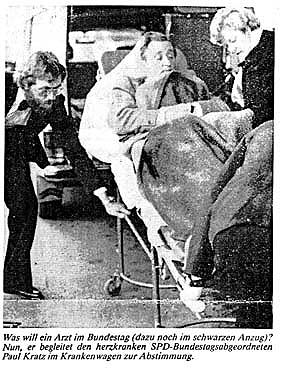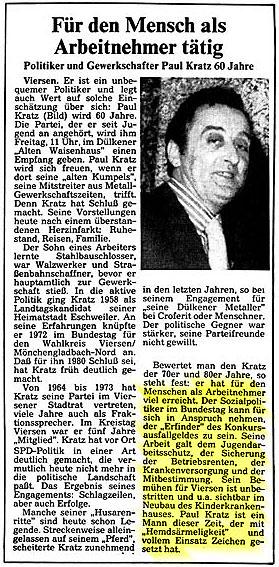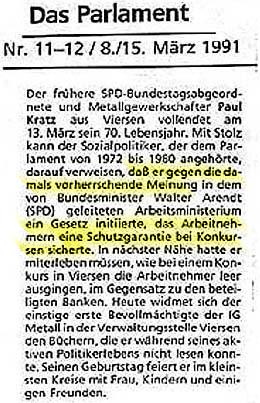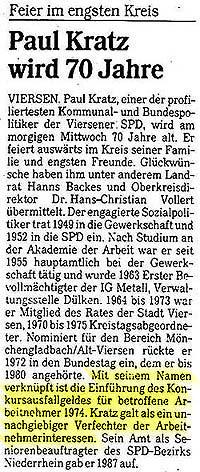 | Zwei, die sich immer verstanden: Pensionär Paul Kratz (links) und Nordrhein-Westfalens Ministerpräsident Johannes Rau im Jahr 1992: ![]() Zwanzig Jahre vorher, 1972, hatte Rau den linken Gewerkschafter Kratz auf einen sicheren Listenplatz der SPD-Landesliste in Nordrhein-Westfalen zur Bundestagswahl und damit als Abgeordneten in den Deutschen Bundestag gehievt. Paul Kratz (Mitte) 1972 mit Willy Brandt und dem damaligen SPD-Bundesgeschäfts- führer Holger Börner: ![]() Paul Kratz in den 70er Jahren mit Willy Brandt: ![]() Der IG Metall-Gewerkschafter Paul Kratz (Mitte) mit dem IG-Metall-Vorsitzenden Eugen Loderer (links) und Nordrhein- Westfalens SPD-Ministerpräsidenten Heinz Kühn (rechts): ![]() Paul Kratz 1976 im kritischen Gespräch mit Helmut Schmidt vor einem Bild des ersten Nachkriegs-Vorsitzenden der SPD, Kurt Schumacher: ![]() ![]() ![]() Die Presse schrieb über Paul Kratz: "... kein Konformist nach der Devise 'Immer mit mit'm Schmidt'". Aber er war auch jemand, der nicht mit dem politischen Gegner gegen seine Partei stimmte, sondern bei Dissenz zur Mehrheits-SPD lieber der Abstimmung fernblieb und dies öffentlich erklärte, wie in einer Frage im Kriegsdienstverweigerer-Recht. Konsequent und konziliant -- deshalb konnte er trotz der sozial- und friedens- politischen Differenzen im persönlichen Gespräch auch mit Helmut Schmidt, der ihm immer zuhörte: Mit SPD-Schatzmeister Alfred Nau: ![]() Im Straßenwahlkampf mit der damaligen Bundesvorsitzenden der Jungsozialisten, Heidemarie Wieczorek-Zeul: ![]() Politisch wurde Paul Kratz ebenso von den Gewerkschaften wie von den Jungsozialisten unterstützt. Kandidatenbrief zur Landtagswahl 1958 in Nordrhein-Westfalen: ![]() Tja, so sahen Sozialdemokraten damals aus, aber wichtiger war ihre politische Botschaft (Rückseite des Flugblattes): ![]() Paul Kratz (links) 1958 mit dem SPD-Parteivorsitzenden Erich Ollenhauer (rechts): ![]() Antifa-Gedenken, als Parlamentarier gelebt: In den 80er und 90er Jahren hatte Paul Kratz immer eine Fotokopie der Debatte des Reichstages zum Ermächtigungsgesetz dabei, um zu zeigen, wer den Nazis die Macht der Diktatur gegeben hatte: Die ach so Liberalen, das ach so christliche Zentrum, die Junker-, Adeligen- und Kapital-Parteien stimmten dem Ermächtigungsgesetz zu; die kommunistischen Reichstagsabgeordneten waren schon totgeschagen oder geflohen, von den Sozialdemokraten saßen etliche schon in den KZ; alle SPD-Reichstags- abgeordneten, die noch frei waren, stimmten als einzige gegen die totale Nazi-Macht. Die Fotokopie des Protokolls der Reichstagssitzung ist tatsächlich das einfachste und schlagendste Argument, das man bei sich tragen kann. Ein zuverlässiger Sozialdemokrat: ![]() ![]() "Westdeutsche Zeitung" 1978 Gewerkschafter unter sich: Paul Kratz mit dem Bundesminister für Arbeit und Sozialordnung Walter Arendt, dem vormaligen Vorsitzenden der Bergarbeiter-Gewerkschaft IG Bergbau und Energie: ![]() Arendt bei einem Empfang zu Ehren von Paul Kratz in den 80er Jahren, als beide schon im Ruhestand waren: ![]() Ehre, wem sie gebührt: ![]() ![]() Über die Parteigrenzen hinweg wurde Paul Kratz als Demokrat, Gewerkschafter und Sozialpolitiker gewürdigt ("Westdeutsche Zeitung" 1981). Zwei, die sich gut verstanden und die sich immer wieder trafen in der Sorge um die Schicksale der "kleinen Leute" -- Herbert Wehner und Paul Kratz: ![]() Oben: "Westdeutsche Zeitung" 1985. Im Bild links Herbert Wehner, rechts Paul Kratz, auf dessen Einladung Wehner vor altgedienten Sozialdemokratinnen und Sozialdemokraten und verdienten Gewerkschafterinnen und Gewerkschaftern sprach. Politische Freunde ... ![]() ... privat in den 80er Jahren: "Onkel Herbert" Wehner zu Gast im Hause Kratz (oben). "Für Wehner war mein Vater 'der Paule'. Als Vorsitzender der Bundestagsfraktion sagte er, wenn er das Wort erteilte: 'Jetzt spricht der Paule'. Und wenn jemand von den akademischen Großkopfeten dazwischen quatschte, paffte Wehner ein paar mal heftig durch seine Pfeife und schrie: 'Der Paule spricht!' Und für meinen Vater war Wehner, wie für viele andere, 'de Onkel Hebbet'." Anerkennung: Noch ein Jahrzehnt nach seinem Ausscheiden aus dem Deutschen Bundestag würdigte die Bundestags- zeitung "Das Parlament" die Person Paul Kratz und seine Arbeit: ![]() ![]() Oben: Auch die konservative "Rheinische Post" erinnerte 1991 an die erfolgreiche Sozialpolitik des Gewerkschafters und Sozialdemokraten, der auch vom CDU-Landrat und dem von der CDU gestellten Verwaltungschef des Landkreises geehrt wurde. |