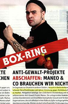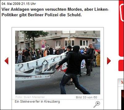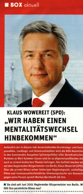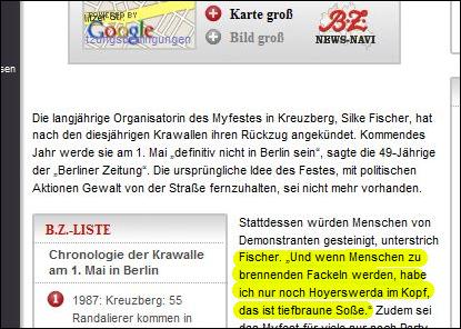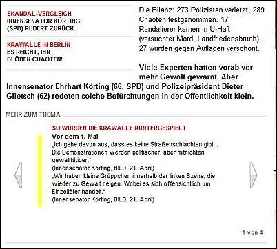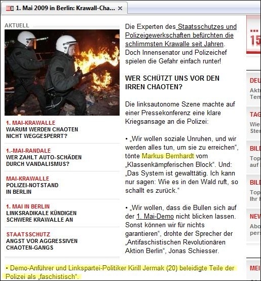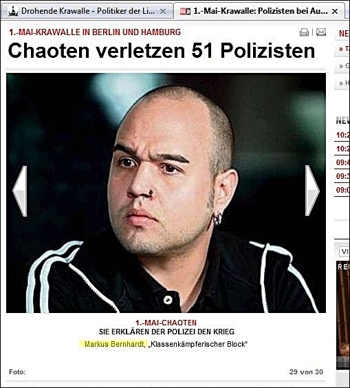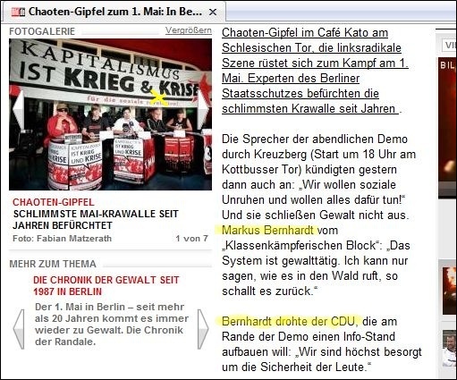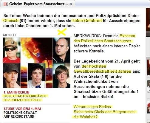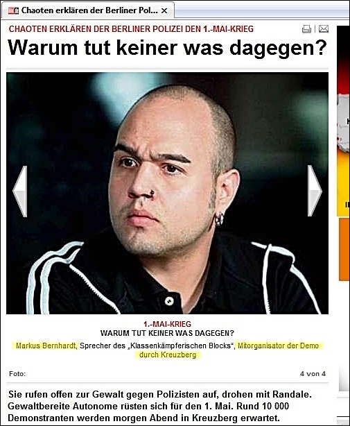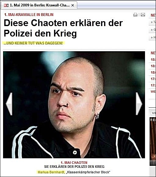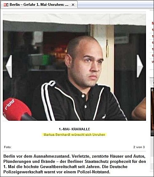zur Gewalt-Demo mit mehreren Fotos und unter verschiedenen Überschriften -- aber ohne die Verbindung Bernhardts zu Wowereit auch nur einmal zu erwähnen: ![]() Markus Bernhardt ruft zur Gewalt auf (oben: gelbes Kreuz durch BIFFF...), ohne dass "Bild" seine Verbindung zu Wowereit erwähnte, die das BIFFF... zehn Tage vorher öffentlich gemacht hatte -- auch gegenüber "Bild". (Alle Screenshots von der Webseite "Bild.de" am 30. April 2009) ![]() "Sie" -- wer soll das sein? Nur kurz vor Bernhardts Demo-Aufruf hatte er freien Zugang zu Klaus Wowereit, um mit dem Regierenden Bürgermeister der deutschen Hauptstadt ein Interview für die von Wowereit seit Jahren unterstützte Gewalt-Sex-Szene und ihre Zeitschrift "Box" zu machen; "Bild" erwähnt es nicht, obwohl auch "Bild" vom BIFFF... darüber unterrichtet worden war. ![]() Warum wohl "keiner" was dagegen tut, und wer "keiner" eigentlich ist -- das erfahren "Bild"-Leser hier nicht. ![]() Oben: Trägt Wowereit Mitverantwortung an den verletzten Polizisten, nachem er einen der Gewaltdemo-Aufrufer sogar hofierte? (Am Ende der Demo waren es 479 verletzte Polizistinnen und Polizisten.) "Bild"-Leser/ -innen erfahren es nicht. Unten: So mag Wowereit seinen Interviewer im Gedächtnis haben: der lieb drein schauende junge schwule Mann, der scheinbar kein Wässerchen trüben kann und den Regierenden Bürgermeister von Berlin wohl nicht lange zum Interview zu bezirzen brauchte, weil Bernhardt selbst zur Gewaltssex-Szene zählt, die Wowereit seit Jahren massiv fördert: ![]() Bernhardt-Interview mit Wowereit für die Gewalt-Sex-Szene im April 2009 in der Zeitschrift "Box", dem einzigen "Medienpartner" des von Wowereit gestützten "Folsom Europe e.V.": ![]() Zwei von nur vier Vorstandsmitgliedern des "Folsom Europe e.V." sitzen in der "Box"-Redaktion. Auch Bernhardt, der wichtigste politische Autor der Monatszeitschrift, die in einigen Sex-Shops und Schwulen-Bars kostenlos verteilt wird und im Internet vollständig kostenlos online zu lesen ist, sitzt in der Berliner Lokalredaktion von "Box". Wowereit steht dieser Szene so nahe, dass er sie im Jahr 2005 sogar im Berliner Abgeordnetenhaus gegen die Kritik des BIFFF... mit einer Rede verteidigte. Bernhardt in demselben "Box"-Heft vom April 2009, in dem er Wowereit interviewen durfte, in der Pose des Gewalttäters: ![]() Bernhardt-Zitate auf "Bild.de" am 30. April 2009, erneut, ohne Bernhardts Verbindung zu Wowereit zu thematisieren: ![]() Wowereit-Spezi Bernhardt drohte auch der CDU, die einen Info-Stand beim Kreuzberger Maifest aufstellen wollte: ![]() Mit diesen Zitaten und Bernhardts Terrorismus-Unterstützung, auf die das BIFFF... am 20. April 2009 noch einmal hingewiesen hatte, wäre die Krawall-Demo zu verbieten gewesen. Doch der Berliner Senat entschied sich dagegen und erlaubte die Bernhardt-Demo, aus der heraus dann mehr Polizistinnen und Polizisten angegriffen und verletzt wurden, als bei jeder anderen vorherigen Mai-Demo seit Wowereits Amtsantritt als Regierender Bürgermeister. Bei einem Verwaltungsgerichtsprozess, den die Veranstalter der Krawalldemo nach einem Verbot um deren Zulassung geführt hätten, wäre wohl Bernhardts Verbindung zu Wowereit gerichtsnotorisch geworden; denn der offizielle Demo-Anmelder war ein Hardline-Politiker aus der "Links"-Partei, und die MfS-Hinterleute hinter Bernhardt, mit denen Bernhardt seit Jahren pro-terroristische Aufrufe unterstützt und propagiert, hätten vermutlich darauf gedrungen, dies taktisch zu thematisieren. Wowereits langjährige und intensive Kontakte zur Gewaltsex-Szene, deren Teil auch Bernhardt ist, wären vor dem Verwaltungsgericht zur Sprache gekommen in einem Prozess um eine voraussichtlich (und dann: tätsächlich) gewalttätige Demonstration. Statt des Verbots schickte die Berliner Innenverwaltung die Polizei in die Schlacht mit den Gewalttätern, die aus der Bernhardt-Demo "Kapitalismus ist Krieg und Krise" heraus die Polizistinnen und Polizisten angriffen: mit Steinen und Brandsätzen. Wurden die Beamten und Beamtinnen verheizt, um Wowereits Gewaltsex-Kontakte zu schützen? Das wirft die Fragen auf: Wie erpressbar ist der Berliner Senat? Welche Bedeutung hat Wowereits langjährige Beziehung zur Gewalt-Sex-Szene dabei? Bestimmen ehemalige MfS-Leute aus dem Hintergrund immer noch mit bei politischen und polizeitaktischen Entscheidungen in Berlin? Bernhardt ist eine zentrale Figur sowohl für die politische Gewaltszene als auch für die Gewalt-Sex-Szene in Berlin. Gleichzeitig legen seine engen Beziehungen zu Rupp und Raussendorff die Vermutung nahe, dass er - jung und unerfahren, lenkbar - politisch von diesen MfS-Resten geführt wird. Und er hat freien Zugang zu Wowereit im Jahr 2009. Auch für Berlins Innensenator Erhart Körting ist Bernhardt kein Unbekannter, denn Körting half dem Gewaltapologeten, durch Interviews mit ihm in der pro-terroristischen Zeitung "junge Welt", in der auch Rupp arbeitet, erst so richtig bekannt zu werden: der hat aber prominente Interview-Partner! Bis zum Ende des Jahres 2005 gab Körting dem Bernhardt für die "junge Welt" etliche Interviews. Berlins Polizeipräsident Dieter Glietsch war vom BIFFF... schon vor einigen Jahren auf Bernhardt aufmerksam gemacht worden, doch Glietsch hatte abgewiegelt. Danach hatte Bernhardt in seinem Buch "Schwule Nazis" Glietsch und die Berliner Polizei massiv angegriffen. Auch hatte Bernhardt in der "jungen Welt" den irakischen Terror-Propagandisten Awni Al Kalemji verteidigt; eine Veranstaltung der pro-terroristischen Gruppen um Bernhardt mit Kalemji, der sich sich kurz vorher im ARD-Magazin "panorama" für Terrorattentate auf irakische Polizisten ausgesprochen hatte, war von der Berliner Polizei verboten worden. Trotz allem, das Glietsch und Körting vor dem 1. Mai 2009 bekannt gewesen sein musste, erlaubten sie die Bernhardt-Gewaltdemo, mit den Folgen, die Berliner Staatsschutz-Experten vorher gesehen hatten. "Bild" stellte die Frage nach dem Warum, gab jedoch keine Ant