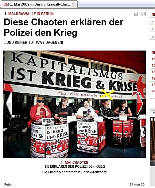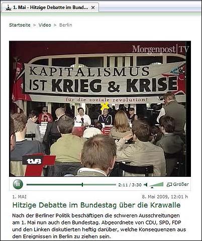Al Qaidas Ernte? Zuerst hatte der Regierende Bürgermeister von Berlin den Al Qaida-Propagandahelfer Bernhardt gehätschelt, dann rief Bernhardt öffentlich und ungehindert zu der Krawalldemo auf. Erleben wir nach den ersten aus dem Al Qaida-Umfeld mit gesteuerten Straßenkrawallen in Deutschland nun die letzten Tage des Politikers Klaus Wowereit? Im April 2009 gab der Regierende Bürgermeister von Berlin dem breit bekannten Gewaltpropagandisten Markus Bernhardt (DKP, "junge Welt", "unsere zeit", bei zahlreichen pro-terroristischen Aufrufen gemeinsam mit den früheren DDR-"Ministerium für Staatssicherheit"-Agenten Rainer Rupp und Klaus v. Raussendorff mit dabei) ein freundliches Interview für die Gewaltsex-Zeitschrift "Box" und plauderte mit ihm über Politisches und Privates. Das BIFFF... deckte darauf hin Bernhardts breite Verbindungen zum deutschen und internationalen Terrorismus auf, bis hin zur Verbreitung der Propaganda Bin Ladens. Am 29. April 2009 brachte das Berliner Boulevard-Blatt "B.Z." aus dem Verlag Axel Springer, am 30. April die "Bild-Zeitung, am 1. Mai die "Berliner Morgenpost" und am 4. Mai schließlich auch der "Tagesspiegel" in seinem Leitartikel denselben Markus Bernhardt als einen Aufrufer zu den 1.-Mai-Krawallen in Berlin-Kreuzberg. "Bild" und "Bild.de" zeigten mehrere Fotos von Bernhardt bei der Pressekonferenz am 28. April 2009 für die Krawalldemo "Kapitalismus ist Krieg und Krise" der von Bernhardt seit Jahren unterstützten pro-terroristischen Polit-Szene. Der Wowereit-Interviewer trat hier als Aufrufer für die Demo auf und forderte: "Wir wollen soziale Unruhen, und wir werden alles tun, um sie zu erreichen." Am 6. Mai dann, als die Medien schon breit über die beginnende Auflösung von Wowereits "rot-roter" Mehrheit im Berliner Abgeordnetenhaus berichten, bringt "Spiegel online" in einem Beitrag Henryk M. Broders über einen irren bayrischen "Linke"-Bundestagskandidaten, der die von Bernhardt mit aufgebaute pro-terroristische Kampagne "10 Euro für das irakische Volk im Widerstand" unterstütze, den Namen dieser Kampagne, der bis dahin fast nur auf der BIFFF...-Webseite im Zusammenhang mit Wowereit-Spezi Bernhardt und auf der Seite des ADR-Magazins "panorama" in einem Bericht über die Terrorismus-Unterstützung der "10 Euro"-Leute erschien. Nach Broders "Spiegel online"-Beitrag fragen plötzlich wieder viele: Was ist das für eine Kampagne? Nächste Frage: Und wieso trifft sich Wowereit mit einem ihrer Vertreter zum Plausch? Weil Bernhardt seit langem den deutschen und internationalen Terrorismus unterstützt und sich auch selbst für den "bewaffneten Kampf" ausgesprochen hat, wäre ein Verbot der 1.-Mai-Demo nach der Pressekonferenz der Demo-Veranstalter sowohl politisch als auch juristisch leicht möglich gewesen, denn zumindest einer der Demo-Aufrufer auf der Pressekonferenz ist breit als politischer Gewaltbefürworter bekannt und stand auch schon selbst wegen Demonstrationsdelikten vor Gericht: Markus Bernhardt. Doch die Berliner Innenverwaltung, die über Bernhardts Aktivitäten bestens unterrichtet sein muss, entschied sich dagegen. Zudem hatte Bernhardt, der auch für die Gewalt-Sex-Szene aktiv ist, die von Wowereit seit Jahren massiv unterstützt wird, erst kurz zuvor ganz selbstverständlich freien Zugang zum Regierenden Bürgermeister erhalten, um das Interview mit ihm zu machen. "Bild.de" zeigte