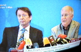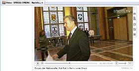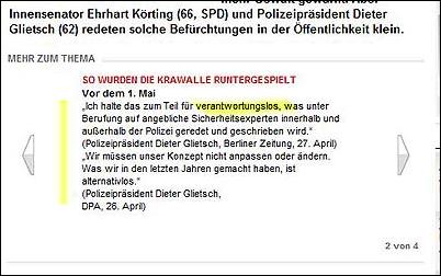 Link zu einer Zitatensammlung des BIFFF... aus live-Berichten des "Tagesspiegel", der "Berliner Morgenpost" und des "Spiegel" über die Krawalle am 1. Mai 2009 in Berlin: HIER KLICKEN Körting und Glietsch schauten bei der Pressekonferenz am 2. Mai, nach den Krawallen, so drein, als ahnten sie bereits, dass sie nicht mehr lange in ihren Ämtern werden bleiben können: Und tschüss: (BIFFF...-Fernsehbildschirm-Fotos von der live-Übertragung der Pressekonferenz im Fernsehsender "n-tv") Terror-Propagandist Markus Bernhardt und sein Hausblatt "Box" aus der von Wowereit seit Jahren geförderten Gewaltsex-Szene um den "Folsom Europe e.V." bekommen selbstverständlich vom Berliner Regierenden Bürgermeister ein Interview, "Spiegel TV" dagegen nicht: ![]() ![]() ![]() ![]() Ein Lehrfilm über gelebte Pressefreiheit: "Guten Tag Herr Wowereit! Wie geht es Ihrer Koalition?", ruft die freundliche "Spiegel TV"-Journalistin in der Filmsequenz von "Spiegel Online", doch Wowi geht mit verkniffenem Lächeln an ihr vorbei, ohne ein Wort zu antworten. (BIFFF...-Screenshots aus dem "Spiegel TV"-Bericht von der "Spiegel Online"- Webseite) |