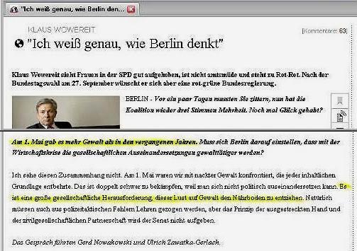 Die "Lust auf Gewalt" kann Wowereit gleichzeitig mit seinem neuen Grußwort zum "Folsom Europe Berlin"-Straßenfest 2009 nähren, ohne dass ihm die Medienhäuser Holtzbrinck oder Axel Springer bisher in die Quere gekommen wären. Kritischer Journalismus sieht anders aus. (Mai 2009)