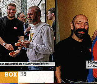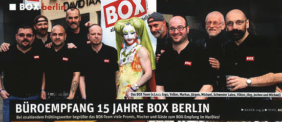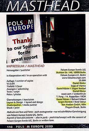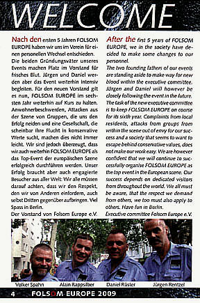 kurz vor der Bundestagswahl, mit den Fotos der vier Mitglieder des "Folsom Europe e.V."-Vorstands und dem neuerlichen Grußwort Wowereits: ![]() Oben links: Titelblatt des Werbeheftchens, oben rechts: auf Seite 4 des Heftchens die vier Vorstandsmitglieder des "Folsom Europe e.V." Volker Spahn, Alain Rappsilber, Daniel Rüster (den Wowereit 2005 mit einer Rede im Berliner Abgeordntenhaus unterstützte) und ganz rechts außen Jürgen Rentzel. Bitte umblättern: nach dem Foto mit Rentzel folgt in demselben Werbeheft auf Seite 6 Wowereits Grußwort an "Folsom Europe e.V." und seine Gewalt-Gäste für das Straßenfest 2009 inklusive Wowi-Unterschrift: ![]() ![]() Oben rechts: letzte Textseite des Werbeheftchens 2009 mit Wowi-Grußwort; das Impressum führt Rüster und Rentzel namentlich auf und nennt als "Medienpartner" die "Box Medien GmbH Köln". Verhöhnung des Rechtsstaates und der Opfer des internationalen Terrorismus: Vorstandsmitglieder des "Folsom Europe e.V." auf dem "Box"-Fest mit Terror-Bernhardt: ![]() "Box"-Heft Mai 2009, Seite 16: Nach den Mai-Krawallen der Bernhardt-Demo "Kapitalismus ist Krieg und Krise" mit Hunderten Verletzten in Berlin-Kreuzberg und der BIFFF...-Veröffentlichung der langjährigen Terrorismus-Kontakte Bernhardts bis hin zur Verbreitung von Al Qaida-Propaganda, auch nach dem Bernhardt-Interview mit Wowereit in "Box" vom April 2009 zeigt sich "Folsom Europe e.V."-Mitbegründer und -Vorstandsmitglied Jürgen Rentzel (Vierter von links) als Pate von Terror-Bernhardt (Dritter von links) und legt ihm die Hände auf die Schultern: sein Zögling. Rentzel ist auch einer der vier Redakteure in der "Box"-Hauptredaktion in Köln, verteilte aber auf dem "Lesbisch-Schwulen Stadtfest" in der Schöneberger Motzstraße auch Visitenkarten von sich mit einer Berliner Adresse. Ganz rechts: Terroristen-Unterstützer, Geschäftsführer der Muttergesellschaft "Box Medien GmbH" und "Box"-Redakteur Michael Zgonjanin aus der Kölner Hauptredaktion des Blattes, Zweiter von rechts: der presserechtlich verantwortliche Redakteur von "Box" Jochen Saurenbach aus der Kölner Hauptredaktion, Dritter von rechts: der Pressesprecher der aus dem Bundesetat finanzierten Deutschen Aidshilfe e.V. Jörg Litwinschuh, der "nebenbei" gemeinsam mit Bernhardt und dem "Folsom Europe e.V."-Vorstandsmitglied Alain Rappsilber die Berliner "Box"-Redaktion betreibt. Auf derselben "Box"-Seite 16 im Mai 2009 weiter unten: Die "Folsom Europe e.V."-Vorstandsmitglieder Alain Rappsilber (links) und Volker Spahn (Dritter von links), die auch noch als "Vorstand Folsom" vorgestellt werden; ganz rechts wieder Terroristen-Unterstützer Zgonjanin. Irrtümlich benennt "Box" hier den Rappsilber in der Bildunterschrift als "Daniel", doch Wowereits Gewaltsex-Spezi Daniel Rüster erscheint erst einige Seiten weiter in demselben "Box"-Heft mit einem Artikel: ![]() In demselben "Box"-Heft vom Mai 2009 auf Seite 32 nimmt das vierte Vorstandsmitglied des "Folsom Europe e.V." Daniel Rüster Stellung zu internen Querelen der von Wowereit unterstützten Berliner Gewaltsex-Szene: Gewalt beim schwulen Sex und Terror in der deutschen und internationalen Politik: Alle vier Vorstandsmitglieder des von Wowereit seit Jahren unterstützten "Folsom Europe e.V." in einem "Box"-Heft mit Terror-Bernhardt vereint -- keineswegs war Wowereits Interview mit Bernhardt im "Box"-Heft vom April 2009 ein Ausrutscher; vielmehr erscheint es als Bekenntnis des Regierenden Bürgermeisters von Berlin Klaus Wowereit zu dieser pro-terroristischen Gewalt-Sex- und Gewalt-Polit-Szene, inklusive Markus Bernhardt und Michael Zgonjanin. Klaus Wowereit ist zum einem internationalen Problem der Bundesrepublik Deutschland geworden. Und er hört nicht etwa auf, sondern macht immer weiter. Ekel und Gewalt auch 2009 wieder mit Wowereit-Grußwort Das oben schon abgebildete Werbeheftchen 2009 des "Folsom Europe e.V." mit dem Wowereit-Grußwort enthält wieder, wie schon bei dem großen Skandal im Jahr 2005, zahlreiche menschenverachtende Gewaltdarstellungen und Ekelbilder, die der Regierende Bürgermeister von Berlin wohl als angeblich geil propagieren möchte. Manche der Bilder verstoßen direkt gegen Artikel 1 des Grundgesetzes und sind diametral gegen die Würde des Menschen gerichtet, werden aber durch Wowereits Grußwort am Anfang des Heftchens quasi geadelt. Ein