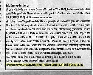 Seit Jahren unterstüzt Berlins Regierender Bürgermeister Klaus Wowereit mit seinem Amt das Sado-Maso-"Fetisch"- Straßenfest des "Folsom Europe e.V.", gegen jeden politischen Rat. Im Jahr 2009 kostet es ihn das Amt. Was vielen bisher nur als Gewaltsex-Tick Wowereits erschien, über den die politische Welt den Kopf schüttelte, hat sich zum internationalen Problem ausgewachsen. Wowereits Schützlinge vom "Folsom Europe e.V." stellen sich im Frühjahr 2009 öffentlich mit dem Terrorismus-Unterstützer Markus Bernhardt vor die Kamera, gleichzeitig bringen sie ihr Straßenfest-Werbeheftchen mit Wowereits Grußwort heraus. Das BIFFF... zeigt hier die Bilder, die auch auf den Internet-Seiten von "Box" und "Folsom Europe e.V." zu sehen sind. Es war nicht nur ein einmaliger Ausrutscher Wowereits, als er dem breit bekannten Terrorismus-Sympathisanten Markus Bernhardt, der im Internet zur Unterstützung des "bewaffneten Kampfes" gegen US-GIs, IDA- und Bundeswehr-Soldaten aufruft und die Gewalt-Demo am 1. Mai 2009 in Berlin mit initiierte, im April 2009 für die Gewaltsex-Zeitschrift "Box" ein freundliches Interview über seine Politik und sein schwules Privatleben gab. Bernhardt ist schon lange Teil der Gewaltsex-Szene um den "Folsom Europe e.V." (FE), für dessen Gewaltsex-Straßenfest sich Wowereit seit Jahren öffentlich und ausdrücklich in seiner Funktion als Regierender Bürgermeister von Berlin stark macht. In den Werbeheftchen des FE für dieses Fest, in denen es von sexuellen Gewaltdarstellungen nur so wimmelt, schreibt Wowereit seit 2005 alljährlich die "Grußworte". Sein erstes mit der Textzeile "Lebensfreude pur" wurde 2005 weltwelt zum Skandal, und Wowereit sonnte sich noch in dieser zweifelhaften Bekanntschaft. Der FE wurde aus der Zeitschrift "Box" heraus gegründet, zwei der vier Vorstandsmitglieder des FE arbeiten zudem als Redakteure von "Box". Die Zeitschrift ist eine Art Vereinsblatt des FE und fungiert als der einzige "Medienpartner" der FE-Wowi-Spezis; sie druckt ebenfalls alljährlich Wowereits FE-Grußworte mit seinem Foto ab. Der hauptsächliche politische Autor von "Box" ist seit Jahren niemand anderes als Terror-Bernhardt, der gleichzeitig gemeinsam mit FE-Vorstandsmitglied Alain Rappsilber im Berliner "Box"-Büro sitzt. Im Mai 2009, nach den Krawallen auf der Bernhardt-Demo "Kapitalismus ist Krieg und Krise" am 1. Mai in Berlin-Kreuzberg mit Hunderten Verletzten, liegen in Sexshops der Berliner schwulen Gewaltsex-Szene die neuen FE-Werbehefte mit Wowereit-Grußwort für das Sado-Maso-Straßenfest 2009 und die Mai-Ausgabe von "Box" mit Bildern der Vorstandsmitglieder des FE und Terror-Bernhardt auf dem "Büroempfang 15 Jahre Box Berlin" aus. Niemand glaubt noch, dass sich die Bundesrepublik Deutschland länger einen Regierungschef an der Spitze ihrer Hauptstadt leisten kann, der seit Jahren politische Beziehungen zu einer scheinbar nur sexuellen Szene pflegt, deren ganz selbstverständlicher und politisch zentraler Teil ein Terror-Hetzer gegen die USA, Israel und Deutschland ist und den Wowereit dann auch noch und ebenso selbstverständlich zu einem Interview empfängt. Werbeheft