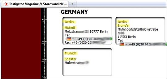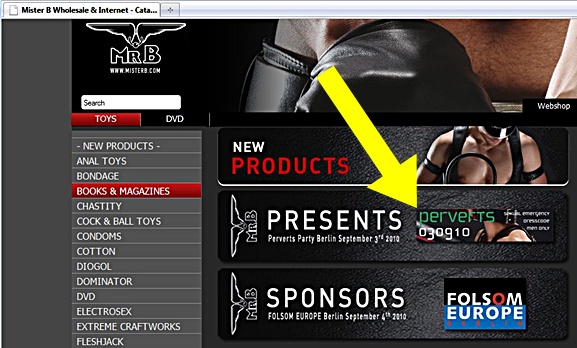 seine Verkaufsstellen in Deutschland, Ausschnitt: ![]() Der schwule Berliner Großverleger Bruno Gmünder mit seiner Landenkette "Bruno's" in Hamburg, Berlin, Köln und München unterstützt im Gegensatz zu dem Münchner Gewaltsex-Laden "Spexter" und dem Berliner Gewaltsex-Laden "Mister B / Mr B" (letzterer ist der Hauptsponsor von "Folsom Europe Berlin") das Gewaltsex-Straßenfest, für das Wowereit alljährlich wirbt, nicht erkennbar direkt. Wir zeigen im Folgenden zuerst Ausschnittte aus dem "Folsom Europe Berlin"-Werbeheft 2010 und weisen besonders darauf hin, dass der Druck des Heftes mit dem Wowereit-"Grußwort" u.a. durch die Anzeigen der "Instigator"-Verkaufsstellen "Mr B" und "Spexter" in dem Heft mit finanziert wurde. Das Werbeheft ist unter der Bezeichnung "Pocket Guide" auch im September 2010 auf der Internetseite des "Folsom Europe e. V." in der Rubrik "Presse" online zu sehen. Sodann zeigen wir, wie "Mr B" in seinem online-Geschäft das "Instigator"-Heft vertreibt und dort ebenfalls für das von Wowereit unterstützte "Folsom Europe Berlin"- Straßenfest wirbt. Immer