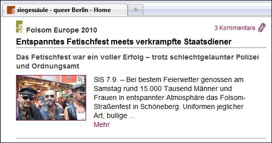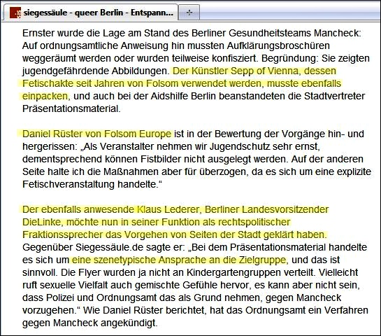 ![]() Offenbar gibt es nach wie vor keinerlei Problembewusstsein dafür, was Gewaltverherrlichung und die Verhöhnung des Leidens der Opfer des Nazi-Regimes eigentlich anrichten. Kommt dies sexuell daher, und kann man auch noch das Wörtchen "schwul" vor sich her tragen, scheint jede Kritik abgeblockt und jede Strafverfolgung wegen der Verletzung einschlägiger Verbote abgewehrt zu werden. Wowereit direkt verwickelt in Verbreitung illegaler Gewaltverherrlichung Das wird im September 2010 wieder deutlich, als Wowereit erneut das Gewaltsex-Straßenfest "Folsom Europe Berlin" öffentlich unterstützt. Im Werbeheft mit Wowereits neuerlichem "Grußwort" wird erneut sexualisierte Gewalt propagiert, und die Sponsoren des Straßenfestes ("Mister B", neuerdings auch als "Mr B", und "Spexter"), die das illegale Gewaltsex-Magazin "Instigator" in ihren Geschäften und online verkaufen, obwohl das strafbar ist, schalten in dem Heft mit Wowereits Grußwort Werbeanzeigen. Würde man nur drei Sekunden das "Folsom Europe"-Werbeheft mit dem Wowereit-Grußwort und die neue Ausgabe des "Instigator" in der "Tagesschau" hochhalten -- die politische Karriere des Klaus Wowereit wäre innerhalb der nächsten zehn Minuten beendet, oder die SPD bundesweit unter fünf Prozent. Es ist spannend, darauf zu warten, wann dies geschieht. Den Konservativen in Deutschland ist offenbar immer noch mehr am Erhalt des "rot-roten" Schreckgespenstes Wowereit gelegen als daran, einen Propagandisten sexualisierter Gewalt anzuprangern. "Instigator" zeigt
