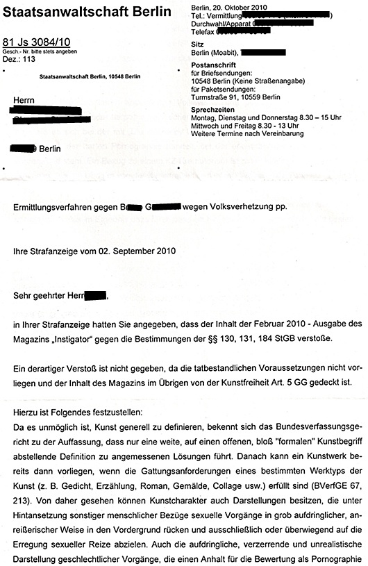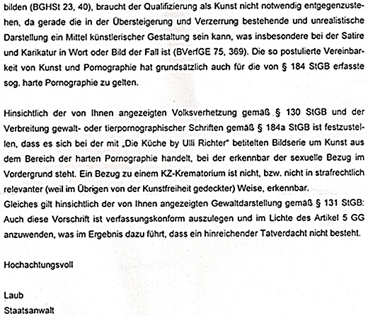 Dann traf der unten abgebildete Bescheid der Staatsanwaltschaft ein. Bemerkenswert: Wir hatten nicht Anzeige erstattet wegen "§ 184 StGB", das ist das Verbot, einfache Pornographie Minderjährigen zugänglich zu machen, sondern nach §184a, der betrifft in jedem Falle immer verbotene Gewaltpornographie. Offenbar war unsere Anzeige nicht einmal richtig gelesen worden. Das "a" zur Paragraphennummer fiel Staatsanwalt Laub erst am Ende seines Bescheides wieder ein. Bemerkenswert auch, dass weder § 131 des Strafgesetzbuches (verbotene Gewaltverherrlichung) noch § 184a (verbotene Gewaltpornographie) überhaupt Ausnahmen für die Kunst zulassen, wie etwa § 86 oder 86a (Verbreiten von Propaganda und Kennzeichen verfassungswidriger Organisationen), bei denen ein Kunstvorbehalt im Gesetz steht. Staatsanwalt Laub beurteilt am Ende seines Bescheides den "Instigator" als "harte Pornographie", was man nur als verbotene Gewalt-Pornographie auslegen kann, und nennt nun auch richtig den § 184a, der jedoch keinen Ausnahmetatbestand für "Kunst" zulässt. Dennoch befindet er, die widerliche Verletzung der Menschenwürde durch die KZ-Krematoriums-Darstellung im "Instigator" unterliege der "Kunstfreiheit". ![]() ![]() Wir haben selbstverständlich bei