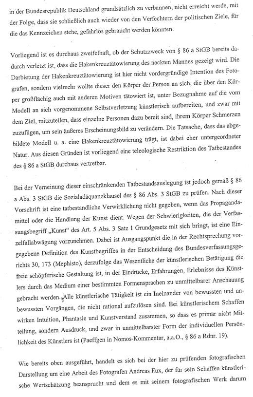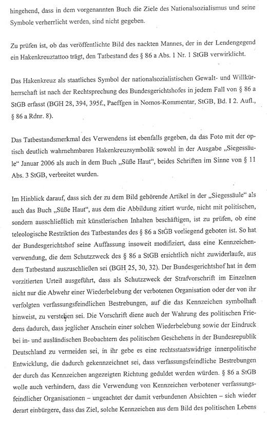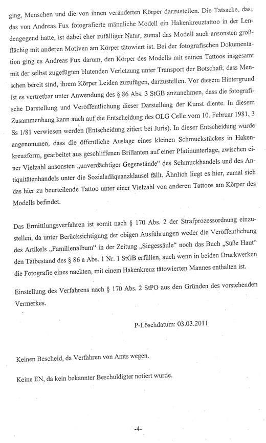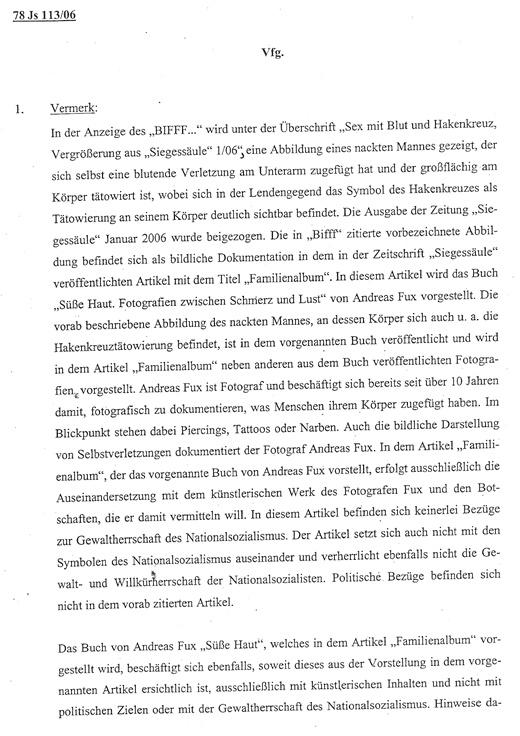 Das Ergebnis der staatsanwaltlichen Ermittlungen zu dem SM-Hakenkreuz-Tattoo ist bemerkenswert, weshalb wir es hier vollständig im Original darstellen. Der Einstellungs- vermerk macht deutlich, wie im Wowereit-Lederer-Berlin jeder Nazi-Dreck, ist er nur sexuell genug konnotiert, zur "Kunst" definiert wird und somit straffrei bleibt. "78 Js 113/06" war das Aktenzeichen des Ermittlungsverfahrens. Eine Korrektur vorweg: Das BIFFF... hatte hier keine "Anzeige" erstattet, sondern ein Informationsflugblatt über den Skandal an Berliner Abgeordnete geschickt, das dann zur Staatsanwaltschaft gelangte. ![]() ![]() ![]() ![]() ![]() Die lange Beurteilung zeigt, wie die