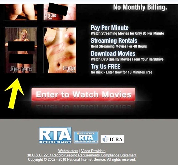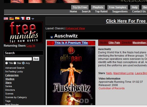 Wohin derartige "Kunst"-Beurteilungen von Gewalt- und Nazi-Sado-Maso führt, zeigt eine neue BIFFF...-Recherche. Freundliche Unterstützer schickten uns einen Link zur Webseite einer offenbar US-amerikanischen Porno-Film-Firma, die einen Gewaltporno herstellte und vertreibt, der "Auschwitz" heißt und in dem KZ-Szenen nachgespielt und Frauen gefoltert werden. Auch in den USA, wo liberalere Pornographie-Gesetze gelten, ist so etwas verboten. Deutsche Staatsanwälte haben auf ".com"-Webseiten keinen direkten strafrechtlichen Zugriff, könnten aber im Wege der internationalen Zusammenarbeit tätig werden. Aber wenn alles nur "Kunst" und "szenetypisch" ist ... ![]() (BIFFF...-Screenshots von dieser