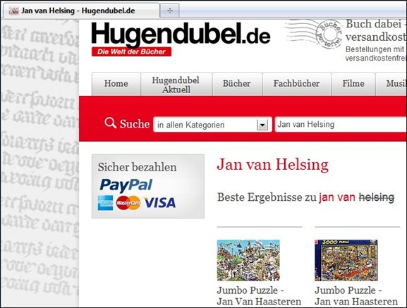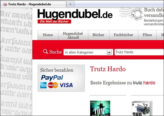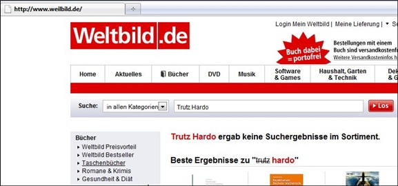 ![]() Oben: Bei der Suche nach "Jan van Helsing" erscheinen auf "Hugendubel.de" jetzt nur noch Bücher anderer Autoren, deren Namen mit "Jan van" anfangen. Helsing/Holey wurde ausgedisst. Unten: Auch die Bücher des rechtskräftig verurteilten antisemitischen Volksverhetzers "Trutz Hardo", der in Wahrheit Tom Hockemeyer heißt, werden von "Hugendubel.de" nicht mehr verkauft; hier erscheinen bei der Suche nach dem Autorennamen ebenfalls nur noch andere Autoren mit ähnlichen Namensteilen: ![]() Dasselbe erfreuliche Bild ergibt sich auf der Internetseite "Weltbild.de" im Onlineshop der Weltbild-Gruppe. Hier werden ebenfalls keine Bücher von Helsing/Holey und Hardo/Hockemeyer mehr online verkauft: "Weltbild.de" Mitte