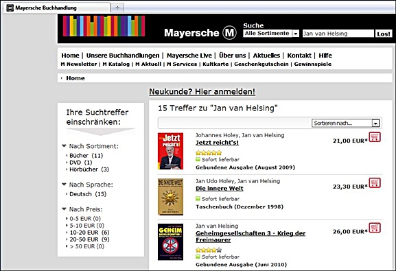 Weiterhin macht die "Mayersche" auch Mitte Januar 2011 offensiv Werbung für den Verkauf der Helsing/Holey-Bücher, indem sie weiterhin die "Kundenrezensionen" von Neonazis auf ihrer Internetseite präsentiert, die zum Kauf der Bücher auffordern und die man über die gelben Sterne neben den Buch-Titelbildern anklicken kann. Teile dieser "Kundenrezensionen" könnten sogar strafbar sein, weil sie volksverhetzenden Inhalt haben. Die "Mayersche" verbreitet sie totzdem weiter online. |