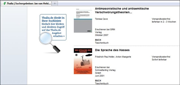 ![]() Die Buchhandelskette "Thalia", die zur Investment-Gruppe der "Douglas"-Drogerien gehört, verkauft weiterhin Hardo/Hockemeyer online. Aber Helsing/Holey wurde bei "Thalia.de" bereits im Jahr 2010 nicht online verkauft. Statt dessen verkauft auch "Thalia.de" die älteren Helsing-kritischen antifaschistischen Bücher. "Thalia.de"