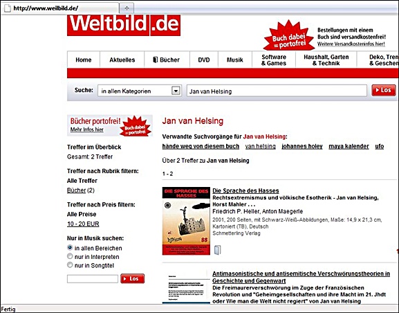 Antifaschistischer Erfolg:über antisemitische Bücher in "Hugendubel"- Filialen bei Karstadt: Die Buchhandelsketten "Hugendubel" und "Weltbild" werfen die antisemitischen Verschwörungstheorien des "Jan van Helsing" aus ihrem Sortiment "Thalia" verkaufte "Helsing" schon vorher